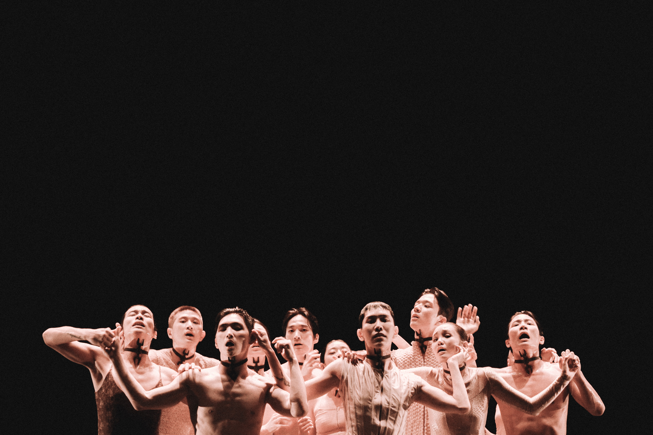 그 가운데 목줄을 찬 존재들은 말미에 이르러 새된 소리를 내는데, 그 이후에 배진호는 더 크게 소리를 지르는 몸짓에 갇힌, 그렇게 장면이 닫힌 채 막을 맞는다. 여기서 처음 막이 열리고 등장한 웨이트리스가 쟁반의 덮개를 열며 나온 커틀러리가 땅에 떨어지게 된 것이 아마도 단서였을 텐데, 턱 아래와 양쪽 쇄골 사이에 꽂은 포크―무대 뒤쪽에서는 보이지 않지만 연습 사진에서는 숟가락으로 대체되었던―를 지지하는 목줄 같은 밴드의 연결로 인해, 그 소리는 경감되거나 변형되었을 것으로 추정되며, 그것이 한층 더 가시화된, 뚜렷하게 목줄을 하고 있는 배진호의 경우, 소리는 안으로만 들리는 결과를 보여주는 것으로 보인다. 곧 소리는 증폭돼 보일 뿐이다.