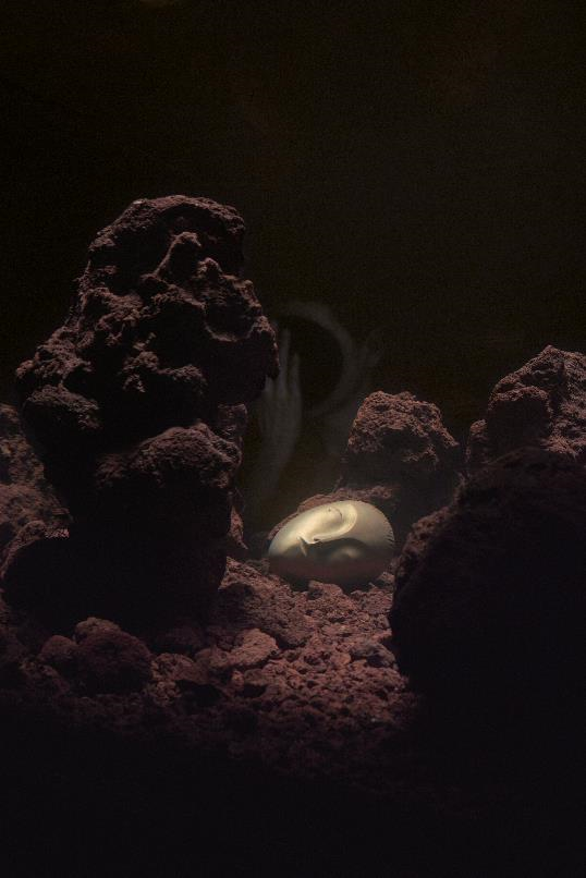 〈휴먼 마스크〉는 물론 또 다른 비인간 생명체를 관찰자의 시점에 두는 〈주드람 4〉(2011. 수족관, 화살게, 소라게, 콘스탄틴 브랑쿠시의 〈잠든 뮤즈〉(1910)를 바탕으로 수지로 제작한 소라 껍데기. 이시카와 재단 소장.)을 그 연장선상에서 (다시) 호출해 오는데, 뮤즈의 잠든 얼굴은 고정되지 않으며, 곧 잠들 수 없으며, 동시에 그 잠듦의 형상을 묵직하게 그 흐름 속에서 지속하는데, 이는 반대편의 소라게의 정향과는 유의미하게 착종되어 나타나는 바가 아니다. 따라서 ‘뮤즈’는 여전히 오브제로서 인장되며, 그것의 살아 있음은 인지적 차원에서 발견되고 단지 구성되는 차원에 그친다. 그 완전한 가라앉지 않음으로서 가면 오브제의 환상적 속성이 체현되는 일부의 순간 안에서, 죽지 않는 존재가 출현한다, 영원히 눈을 감고 잠듦을 수행하는 기이한 존재의 전면적 응시가 우리를 마주하면서. 따라서 소라게라는 존재는 그 환상의 지지체이지만 그 환상을 역설적으로 방어한다.