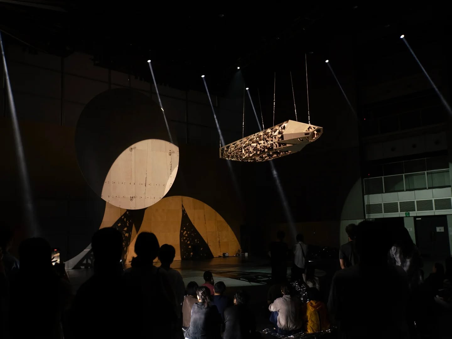 무언가가 생겨나고 사라짐을, 어떤 토대도 근거도 없이 그것이 일어남을 보여주는 서사는 바로 천지창조의 신화일 것이다. 이 생성·소멸의 서사를 형식적으로 완수하는 것이 곧 설치·철수의 행위이다. 따라서 거대한 무덤으로서 공간은 무한한 변화의 이미지들의 생성과 죽음을 담는 텅 빈 그릇이 된다. 극장의 무대 반입구가 열리며 그 안의 또 다른 공간이 경유되며 현실과 환상의 경계가 만들어진다. 이 열린 문틈은, 무덤을 경유해 우묵한 바닥에 담기는 빛과 감각을 다룬 1막 이후, 평평해진 공간 전체의 소실점으로 자리하며, 공간을 관통하는 신체들의 통로가 된다.