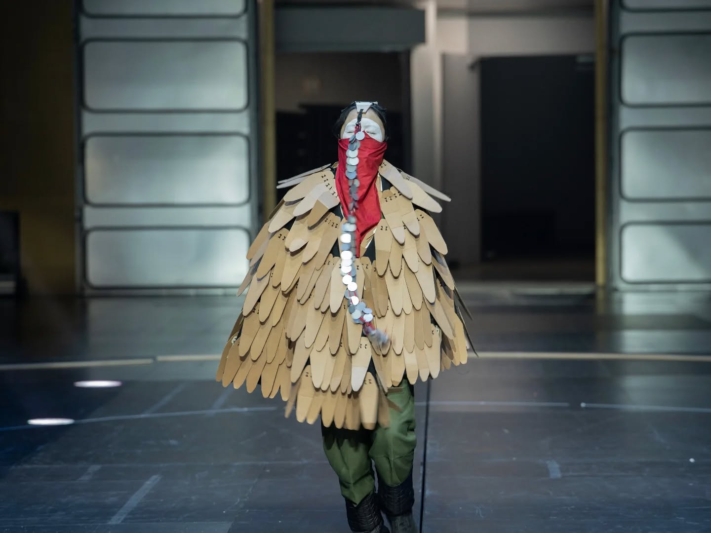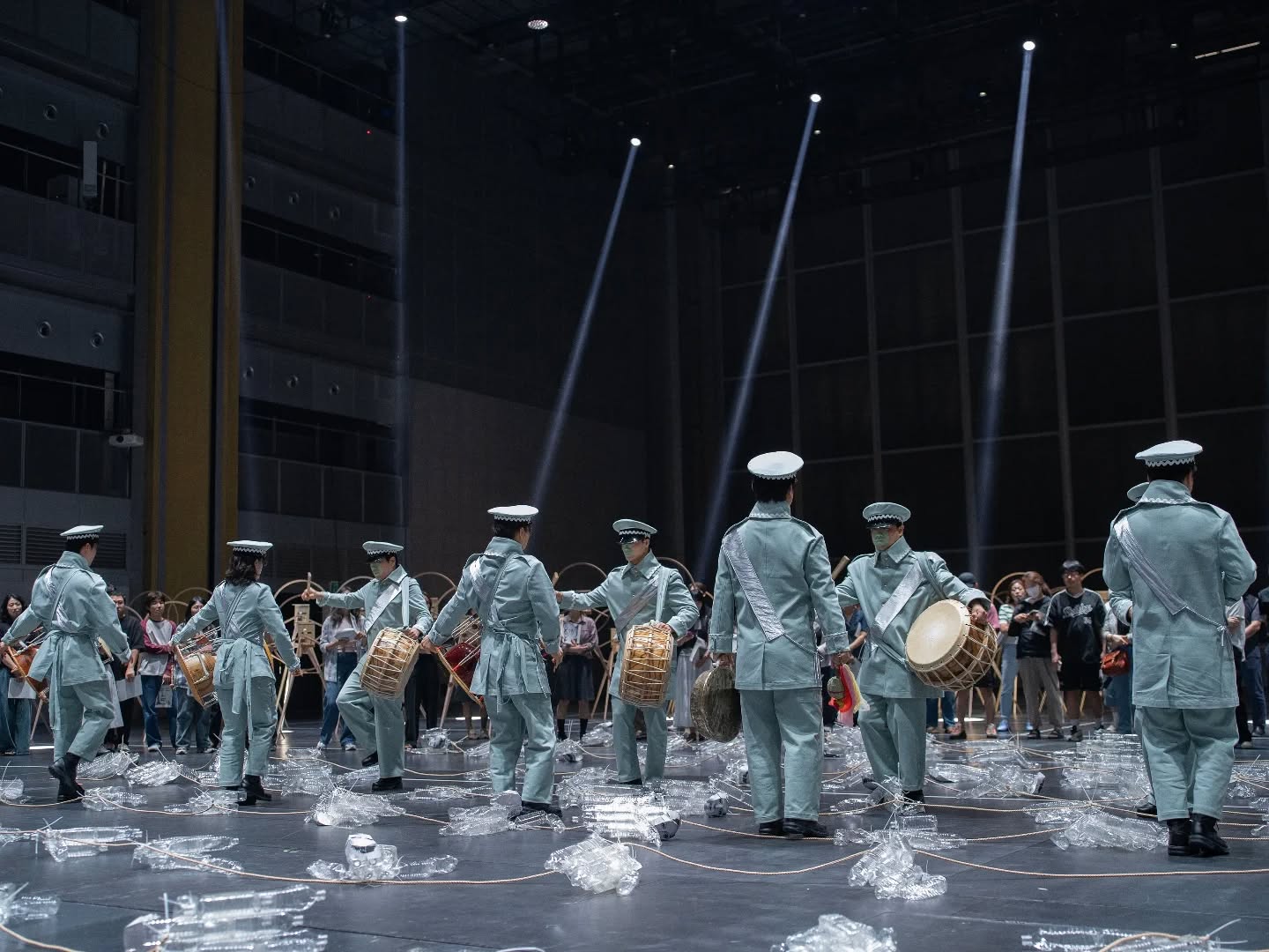 또 다른 공수 부대의 폭력은 3막에서 동유럽의 장교복을 단체로 입은, 상쇠 김복만을 필두로 한 전남도립국악단의 농악이 길게 펼쳐지는 시간으로, 익명의 사람들 가면이 군데군데 연결된 바닥의 투명한 페트병들 집합이 마지막에 위로 솟구쳐 올라간다. 민중을 환유하는 페트병과 농악 자체는 뚜렷한 존재로 가시화된, 죽음의 세계에서 온, 얼어붙은 병사들의 감흥 없는 집합적 움직임에 의해서 역설적으로 그 둘의 연결성을 획득한다. 음악은 폭력을 재현하지만, 민중의 신체로 현상되고, 폭력의 주체들은 죽음의 세계 안에서 폭력을 애도로 전치시킨다. 존재의 이중적 몸짓은 죽음과 삶의 통합적 관점 아래 다분히 모호한 것으로 희석된다. 죽음을 거슬러 올라가려는 시도는 그 죽음의 문턱을 통과할 수밖에 없게 하며, 그리하여 우리는 태초보다는 연옥이나 지옥의 풍경 아래 놓인다.