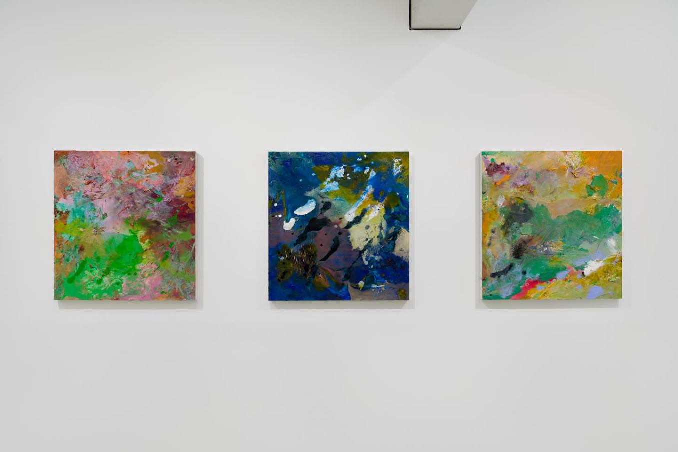 〈녹색은 잎으로〉로 돌아온다면, 그 순서상 3번의 작업이 5번과 뒤바뀐 채 배치되어 있다. 중하단부를 차지하는 녹색의 흔적이 새겨진, 녹색의 비중이 가장 짙은 두 그림은 하나는 밝고 하나는 침착되어 있는데, 이 시퀀스상의 교환 아래, 마지막에 있을 그림이 중앙에서 밝게 드러나게 된다. 여기서 지칭되는 “녹색”은 무엇인가. 그리고 “잎”은 무엇인가. 순수한 색감과 형상으로서 전체 회화와 어떻게 이 관념은 관계 맺고 있는가. 거꾸로 어떻게 그 관념이 표현될 수 있는가. 표면 위의 얼룩이 아닌 지표면 자체의 흔적이 “으로”의 변화를 더 정확하게 반영하는가, 그 “으로”에 따라 색은 형상으로 변화됨을 좇는 것일까.