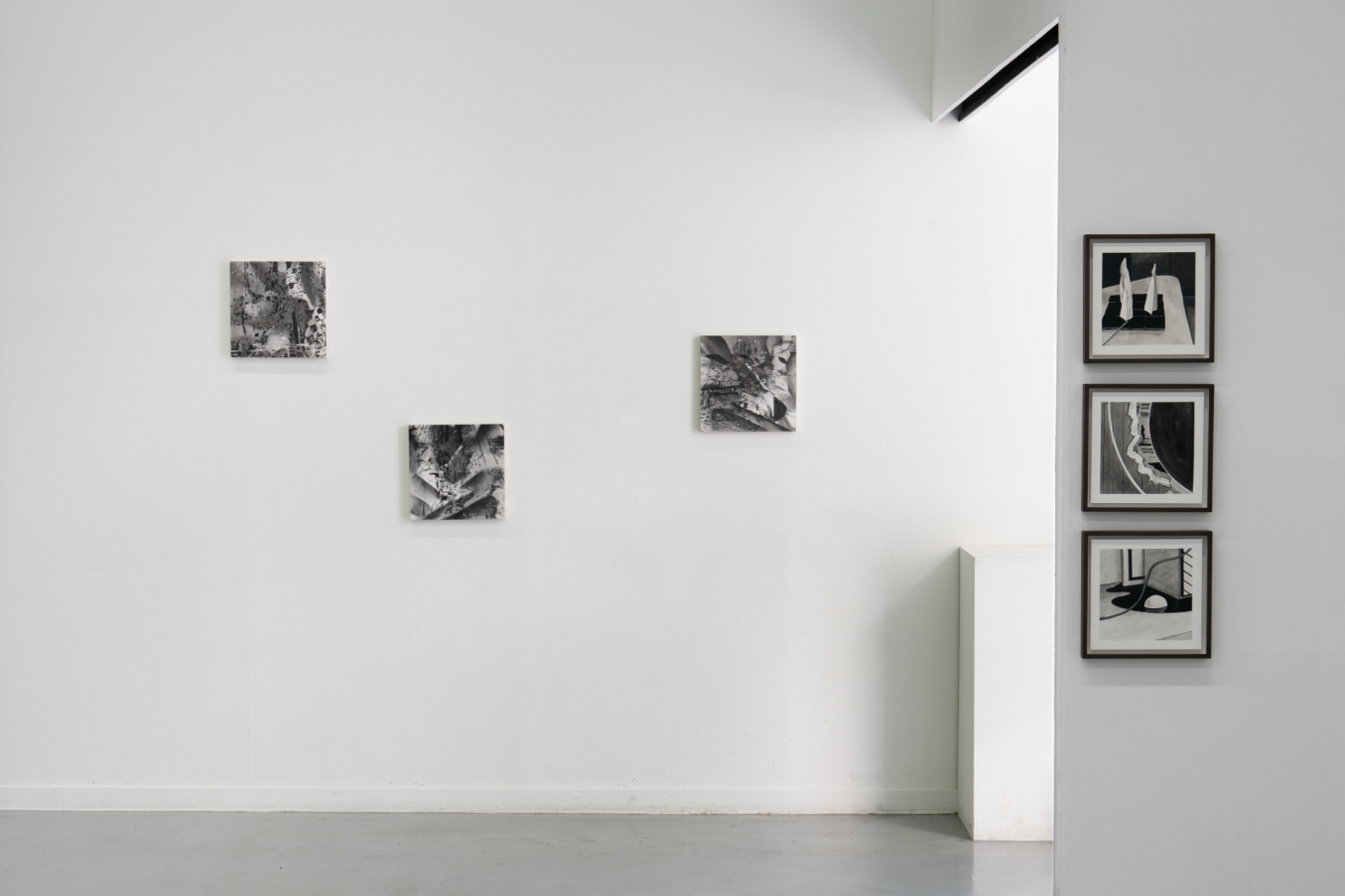 파편들의 이미지는 색을 쓰지 않은 대형 작업들을 가리키는데, 이는 색을 쓰되 정물화의 도식이 남아 있는 초현실주의적 도상 배치의 작업들보다 뒤늦게 진행된 작업들이다. 색채를 물감의 성분 측정으로 치환하고 이를 다시 재현하는 작가만의 강박적 기록 시스템의 과정에 속해 있던 이 색채 회화의 계열에서 정물―〈가까스로(Barely)〉(2024. 120×90cm, acrylic on paper.)에서 왼쪽 경계선에 가까이 자리한 원기둥, 〈사라지지 않기를(Hoping Not to Disappear)〉(2024. 116.8×91cm, acrylic on canvas.)에서 상단 왼쪽과 하단 중앙부의 패널과 그 끝의 구를 비롯한 뚜렷한 도형들―은 혼잡한 이미지를 물론 꾀지는 않지만 구분점이 되어 주는 정도의 안정화를 가능하게 한다면(그것은 뚜렷한 형상에 가해진 색상의 명확함으로 다가온다.), 색이 사라졌을 때 더 이상 그러한 구분점은 특이점이 되지 않는다는 점은 중요한 변화의 기점이지만, 그럼에도 그것이 이미지의 파편화에 대한 전적인 이유가 아님에 유의할 필요가 있을 것 같다.