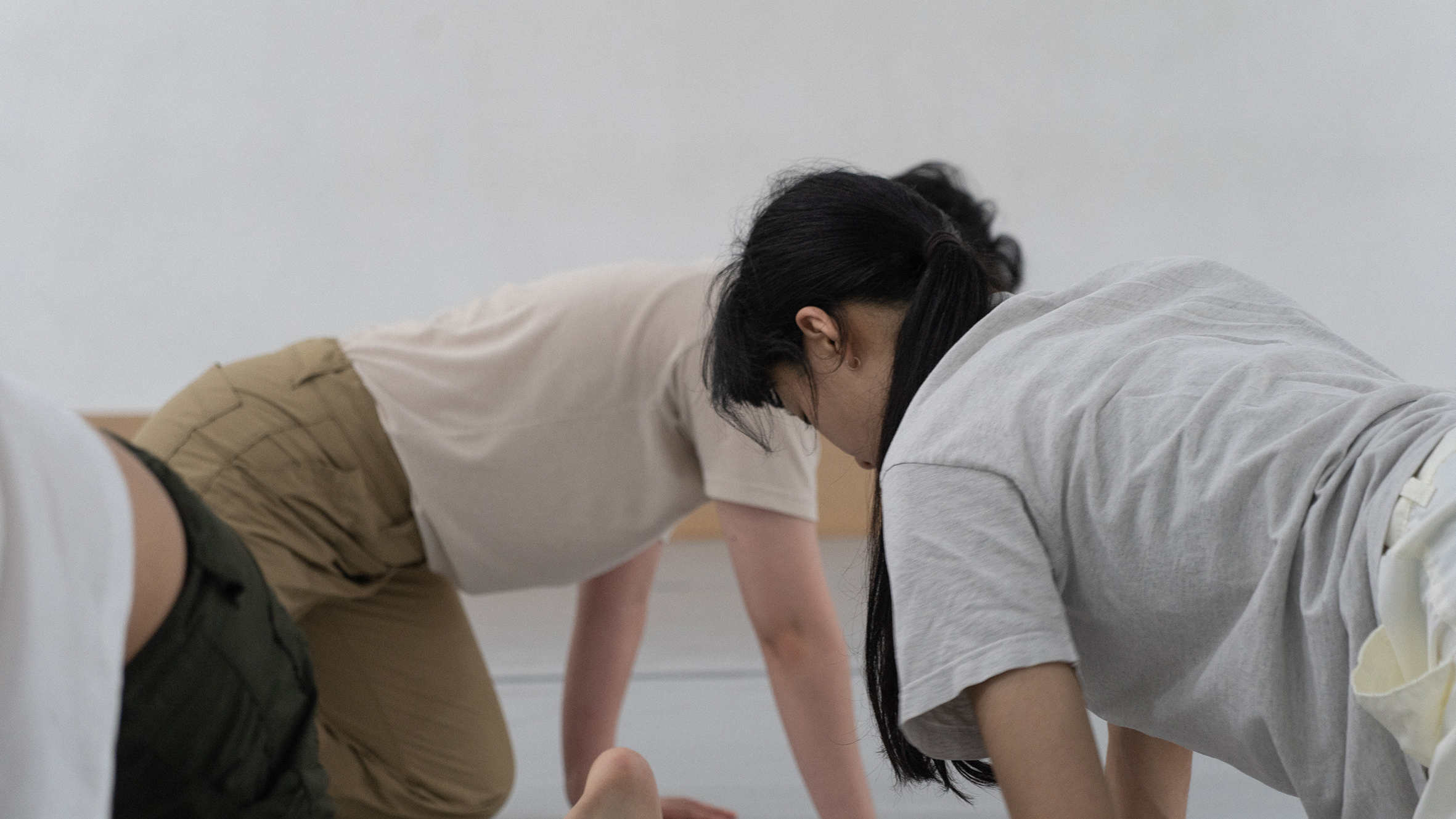 두 번째 움직임은 기어가는 것이다. 여기서 주목되는 건 몸의 이동 경로가 아니라, 그리고 전체의 몸(의 흔들림)이 아니라 바닥과 손의 접촉이다. 손은 끊임없이 무언가를 짚는데, 앞서 (시)공간이 몸(의 중앙)으로 수렴되었다면, 이제 시선은 아래를 향하며 우리의 시선은 그 몸을 따라 아래를 향하게 된다. 앞선 몸이 공간을 향해 열린 채 공간으로 확장되고 동시에 공간을 수렴하고 있었다면, 뒤의 몸은 공간을 파고들며 동시에 공간으로부터 수렴되고 있다고 하겠다. 곧 몸은 공간을 지시하고 가리킴으로써 공간 전체가 아니라 공간 전체를 지시해 가는 공간의 일부로서 자리한다.