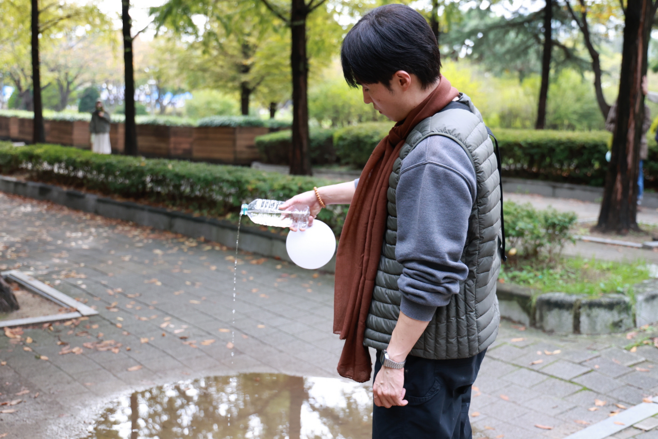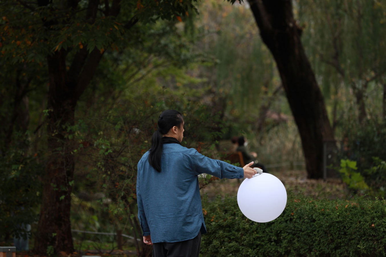 이 떠다니는 입자들로서 연결되는 집단은 지역 내의 개별 주체의 서사를 미미한 움직임과 관계의 정동으로 바꾸는데, 움직임의 우태욱과 사운드의 타무라 료는 그 경계의 한 축을 이루는 배경적 기능을 한다. 가장 주요하게 공연 전반을 잠식하지만, 그것이 서사의 일면을 가시화하거나 고유한 역할로 정체화되지는 않는다. 이들은 이동의 표지이자 이 집단을 엮는 매개항에 가깝다. 아마 가장 긴 시간 걸었을 미얀마 거리 이후의 부평공원에서는 나뭇가지를 건네거나 메마른 잎사귀 표면이나 물 묻은 잎을 감촉하게 하거나 하는 관객과의 상호작용이 제일 많이 일어나는데, 그것은 이 풍경을 다소 증폭시켜 지각케 하는 부분으로, 이로써 퍼포머들은 가시화되기보다 이 풍경을 일정 부분 빌려옴으로써 매개하는 역할에 전적으로 머문다.