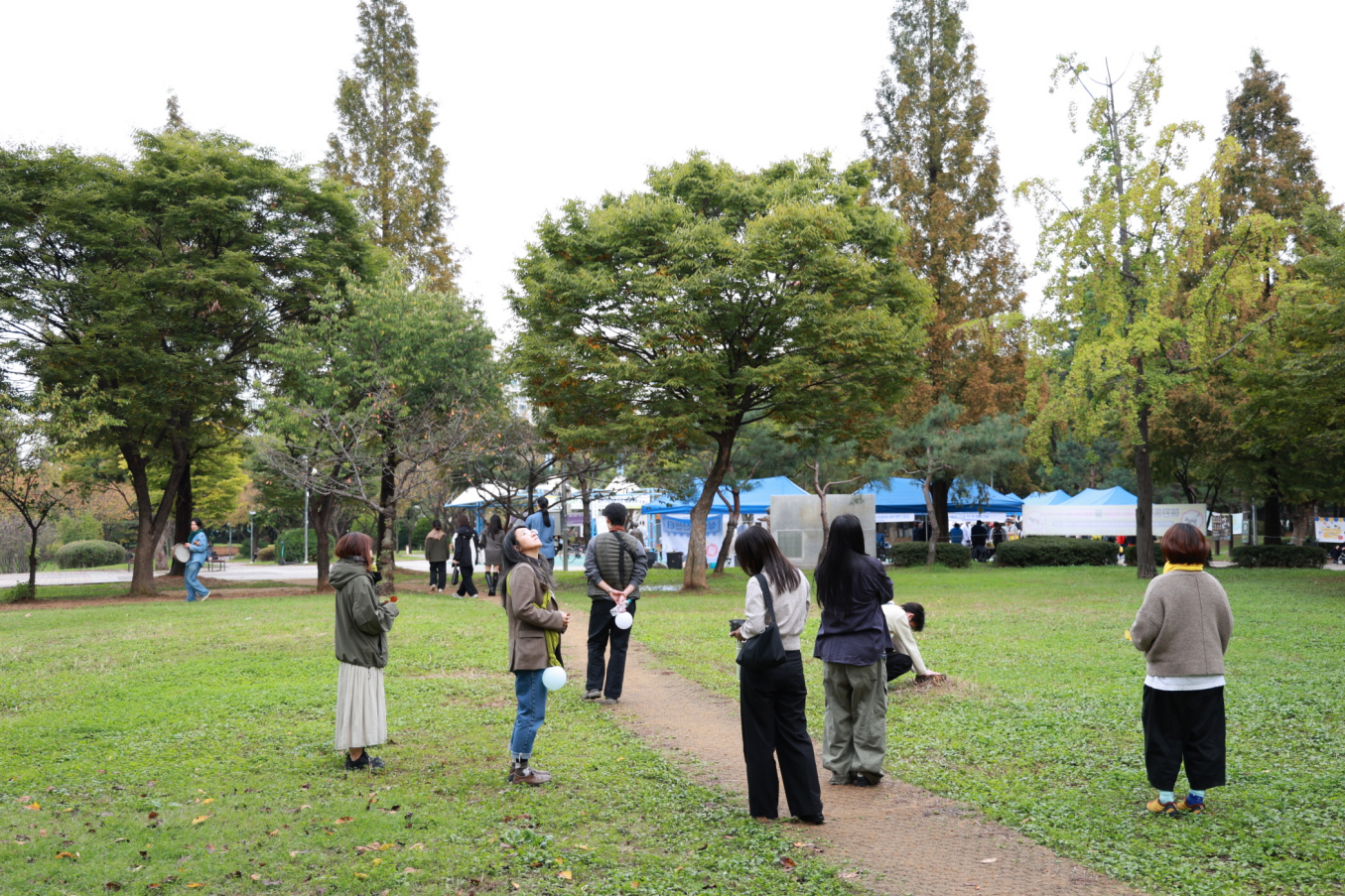 이 떠다니는 입자들로서 연결되는 집단은 지역 내의 개별 주체의 서사를 미미한 움직임과 관계의 정동으로 바꾸는데, 움직임의 우태욱과 사운드의 타무라 료는 그 경계의 한 축을 이루는 배경적 기능을 한다. 가장 주요하게 공연 전반을 잠식하지만, 그것이 서사의 일면을 가시화하거나 고유한 역할로 정체화되지는 않는다. 이들은 이동의 표지이자 이 집단을 엮는 매개항에 가깝다. 아마 가장 긴 시간 걸었을 미얀마 거리 이후의 부평공원에서는 나뭇가지를 건네거나 메마른 잎사귀 표면이나 물 묻은 잎을 감촉하게 하거나 하는 관객과의 상호작용이 제일 많이 일어나는데, 그것은 이 풍경을 다소 증폭시켜 지각케 하는 부분으로, 이로써 퍼포머들은 가시화되기보다 이 풍경을 일정 부분 빌려옴으로써 매개하는 역할에 전적으로 머문다.