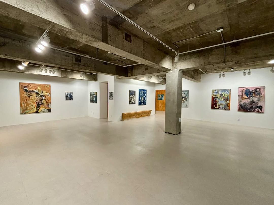 투박한 기호의 유희와 생명 서술의 차원으로 연장되는, 중첩되는 순간은 〈현람애월민〉(2024. 캔버스에 유채, 117×91cm.)에서 드러나는데, 간략화된 상단의 하늘색 인간 형상들의 손 잡음은 단순한 기호의 차원에 대응하면서도 중단에서 하단 사이의 더 큰 인간 형상, 두 눈으로 분별되는 이 신체로부터 그의 축소된 버전으로서 기입됨으로써 그것이 지닌 장식의, 표층의 가벼움을 상쇄한다. 반면 노란색 애벌레 같은 기호들은 하단에서는 명확하고 그 이외에는 장식으로서 특성이 강조되는데, 이는 또한 중앙의 커다란 인간의 눈 주변으로 자연스레 합산되며 합목적적 경계를 이루며, 크게는 노란색과 하늘색으로 구성된 인간 형상으로부터 확장되는, 전체의 범주 아래 자리할 수 있게 된다.