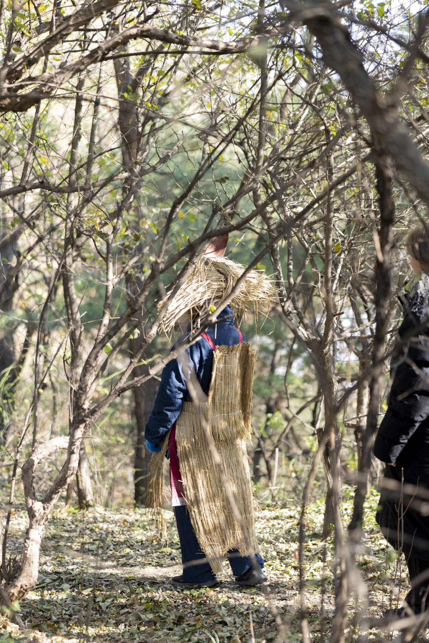 우리는 세 다른 영역을 만난다기보다는 세 영역을 잇는 과정을 통해 그 경계 없음을 체현하는 존재가 된다. 짧은 경로는 이 통합에 대한 환상을 추동하고 그 틈새를 환상적으로 봉합한다. 마치 셋은 구분되지 않고서 하나의 존재인 듯 혼동된다. 짚으로 엮어 만든 모자 탈을 쓴 이들은 그 스스로는 언어가 없이 언어를 두루마리 종이에 적힌 종이를 보여주는 것으로써 단지 매개만 할 뿐인데, 그들이 가진 상연성 역시 입구와 출구의 경계를 표하고 시간을 셈하는 기능적 차원에서 특별히 더해지는 부분이 없다.