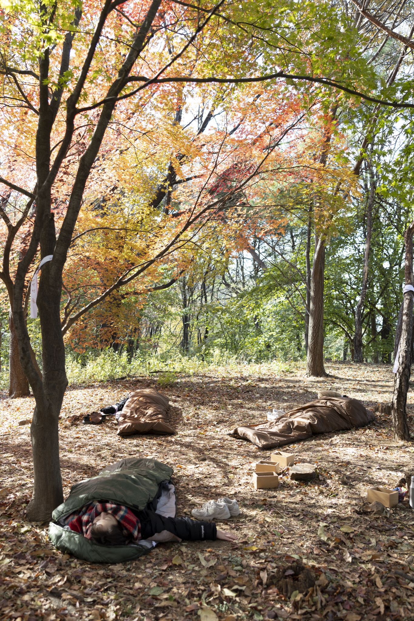 사적 기억으로서 궁동근린공원에 대한 장소적 문맥은 《보편타당한 숲》에서 언급되지는 않는데, 이는 플랫폼 팜파라는 작가의 개인 집을 예술 공간으로 전유했던 지난 10년의 경험과 연관 지을 수도 있지 않을까. 이 과정에서 1조의 세 명만 채집 상자를 들고 이곳으로 이동하게 되는데, 이때 어쩌면 가장 주요한 의례로서 행위가 공연 절차의 너머에서 이뤄지게 된다. 따라서 아쉬운 건 이 옮김의 행위, 들고 걸으며 장소 자체로만 특정되는 부대의 시간을 겪는 수고로움의 행위가 사실상 어떤 서사의 차원에서 자리 매김되지 않았다는 것이다.