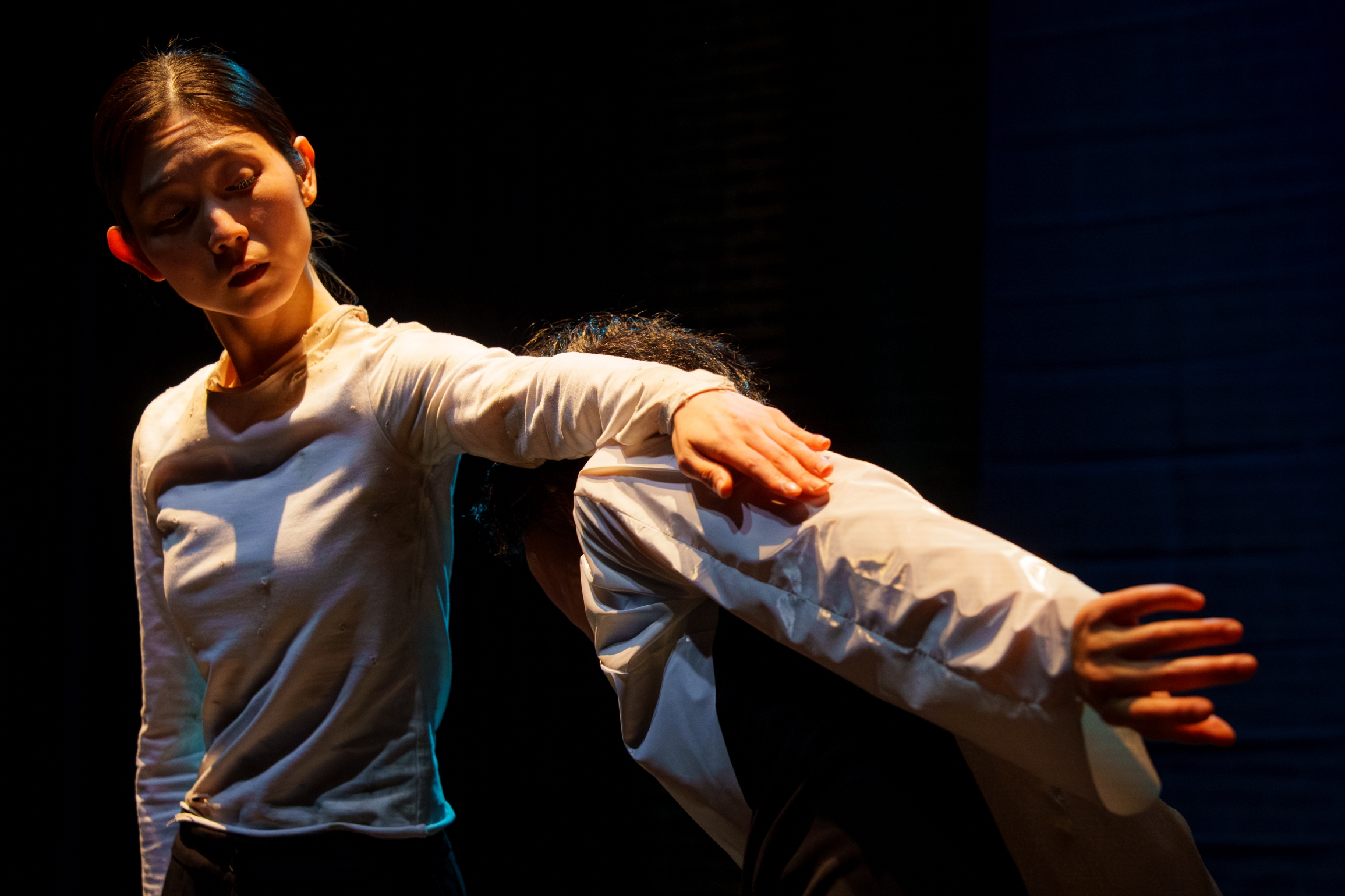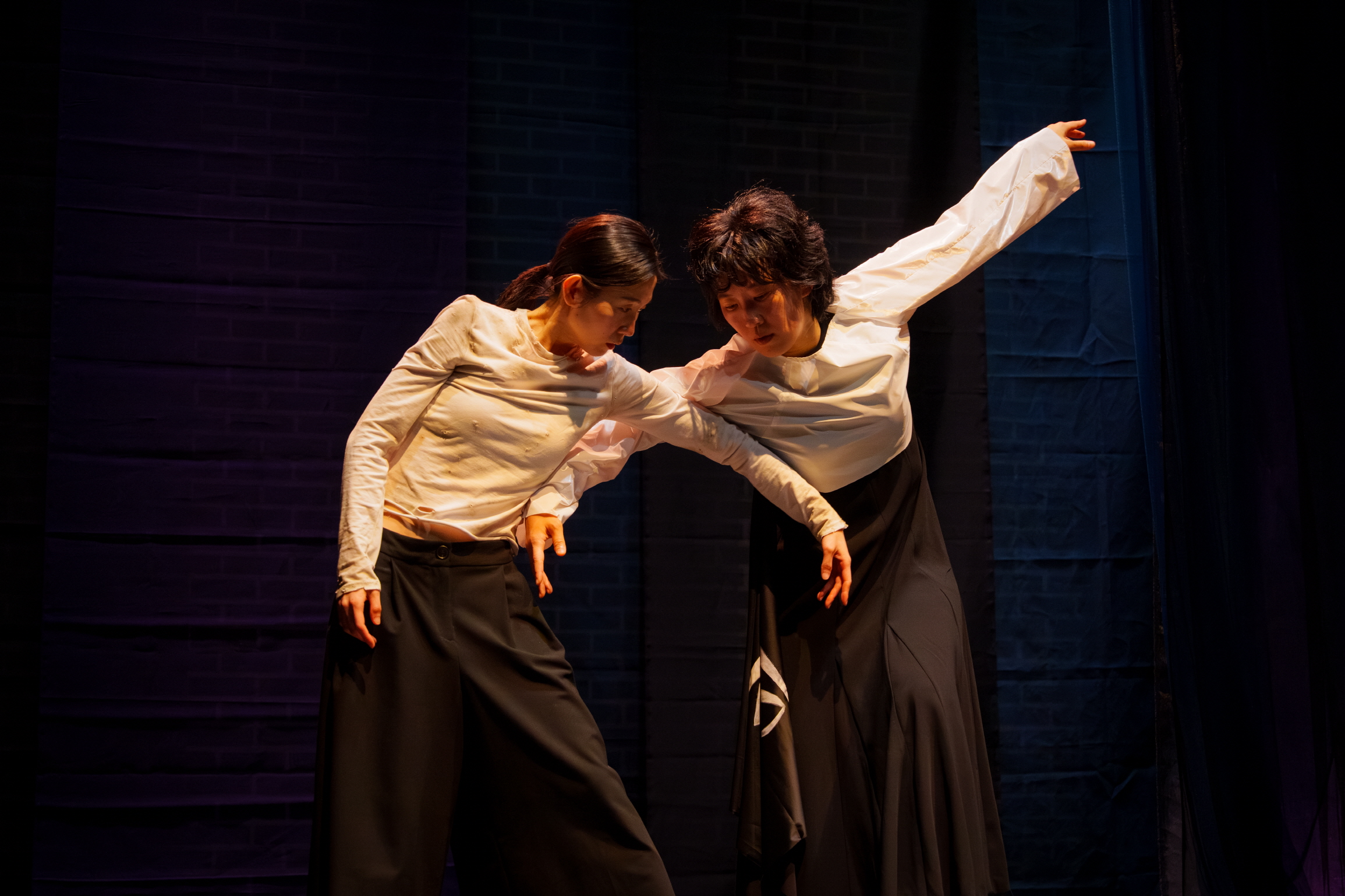 조진호, 〈전야제: 겨 터를 열다〉[사진 제공=신촌문화발전소](이하 상동). (좌측부터) 조진호, 허윤경. 〈전야제: 겨 터를 열다〉(이하 〈전야제〉)는 겨드랑이와 관련한 여러 서사적 조각을 연결하는 조진호의 디에게시스적 경로를 따르는데, 여기에는 신체 특정 부위로서 겨드랑이와 상응되는 움직임의 탐색, 겨드랑이를 관계의 접합부로 활용하는 두 사람의 긴밀한 구조적 움직임의 실천이 경유된다. 처음 조진호는 무용에 입문해 레오타드를 하며 겨드랑이에 민감하게 된 자신의 원-경험에서 출발하지만, 겨드랑이에 관한 애착 심리의 차원에서 자신의 무용사를 정리하는 것으로 연장하기보다는 밤 야(夜) 자의 상형문자 풀이를 통해 겨드랑이를 의식의 차원으로 고양해 내고자 한다.