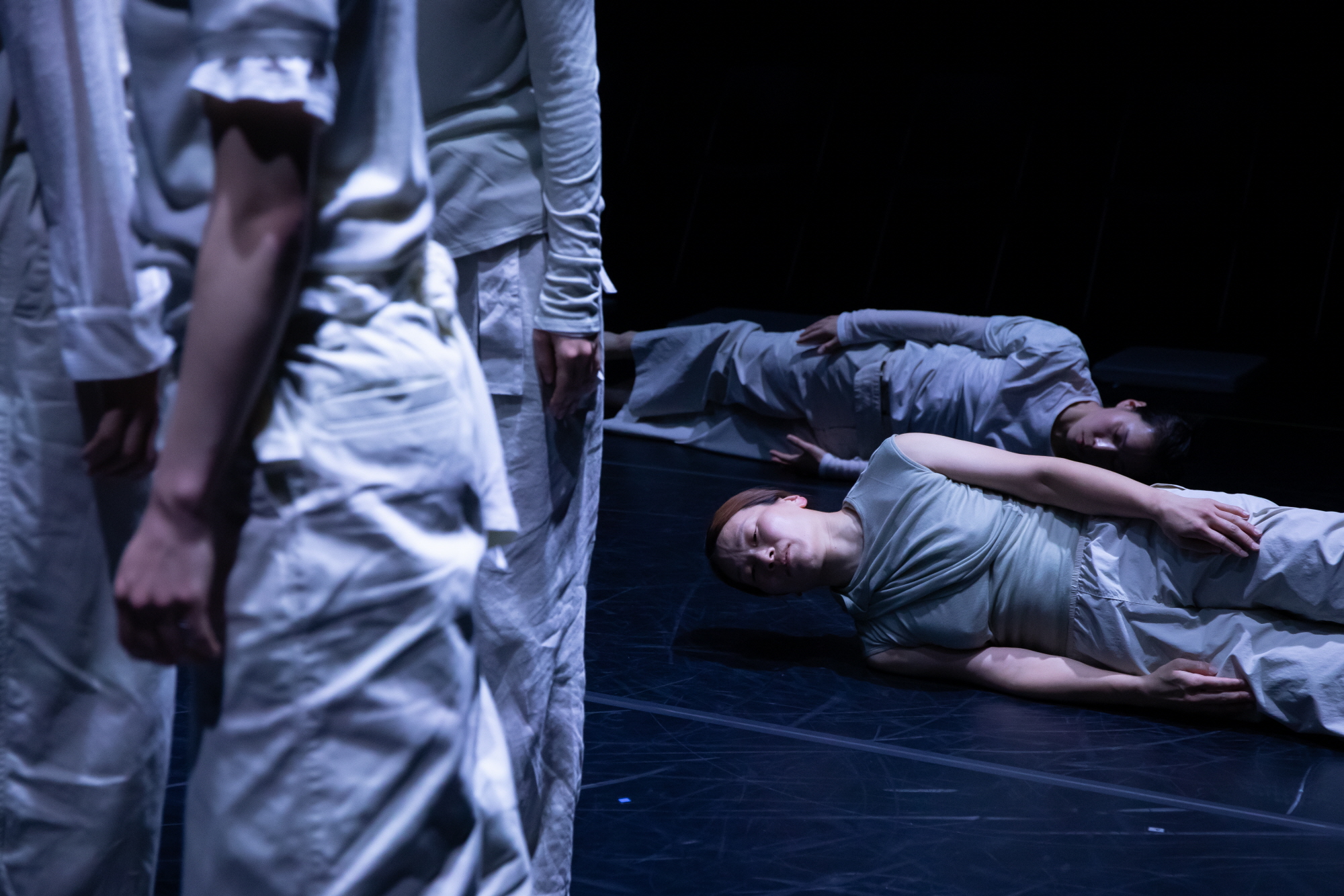 이때 움직임은 서서 터덜거리는 걸음이 채 되지 않는 움직임, 마치 수면 중에 있어 어떤 특정 방향도 지시하지 않는 제대로 기능하지 않는 것 같은 움직임이다. 이 몸은 다시 두 팔을 모은 채 바닥에서 버둥거리며 몸을 순간적으로 뒤집는 움직임으로 변화한다. 전자에서 하나의 발이 바닥에 붙어 있음을 유지한다면, 후자에서는 두 팔이 골반 아래쪽에 붙어 있음을 유지한다. 신체의 제한이 걸림은 그것이 비의식적인 차원에서 연유한다는 것과 결부되는데, 이는 신체의 기본적인 메커니즘이 어떤 차이로 연장될 수 있을까에 대한 사고 실험적 차원에서 시작되는 안무의 특질을 가시화한다.