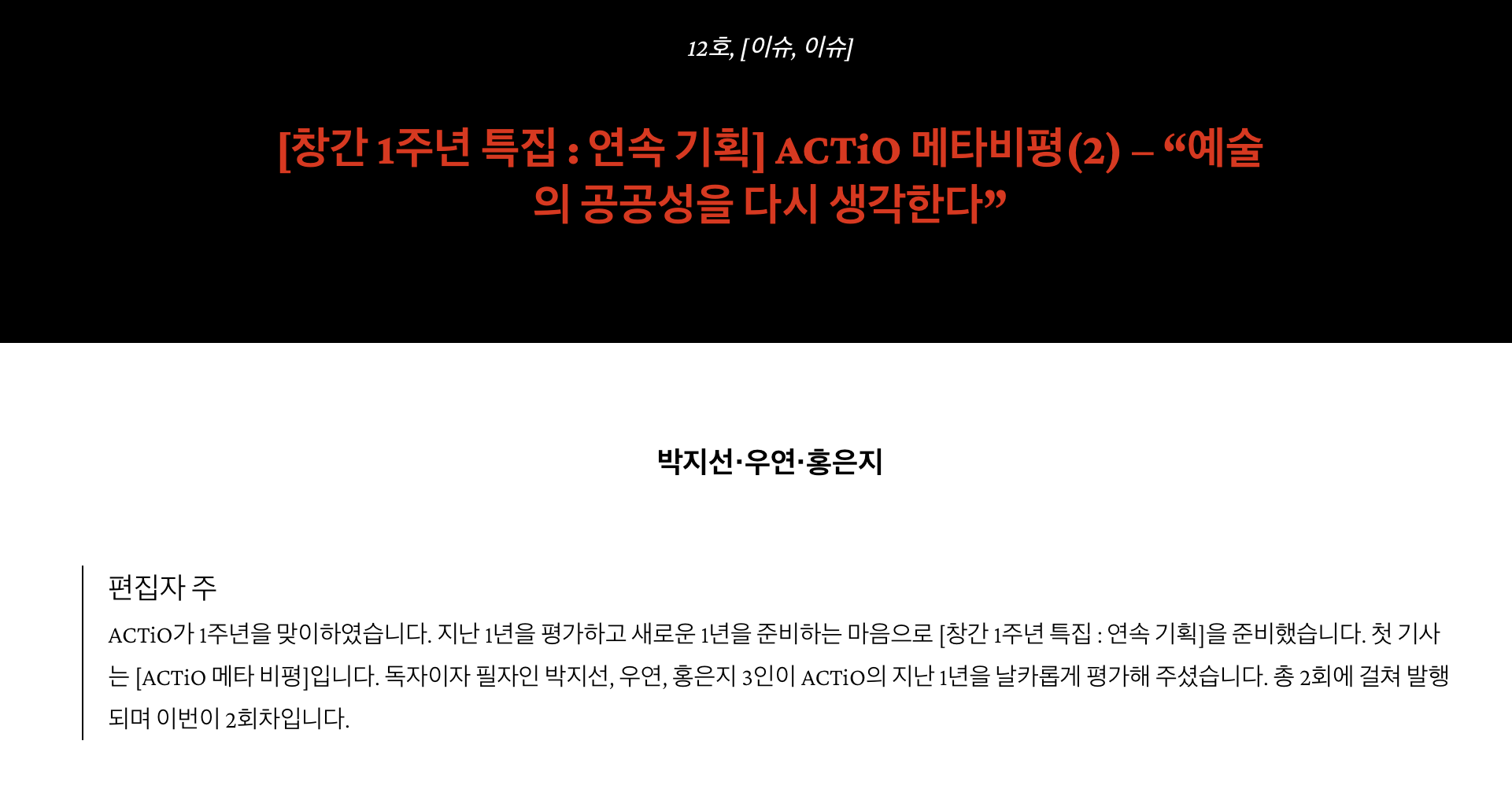 박지선‧우연‧홍은지, 〈[창간 1주년 특집 : 연속 기획] ACTiO 메타비평(2) – “예술의 공공성을 다시 생각한다”〉, 《악티오》[이미지=홈페이지 캡처] 출처=https://actiowebzine.com/2026/02/02/%ec%b0%bd%ea%b0%84-1%ec%a3%bc%eb%85%84-%ed%8a%b9%ec%a7%91-%ec%97%b0%ec%86%8d-%ea%b8%b0%ed%9a%8d-actio-%eb%a9%94%ed%83%80%eb%b9%84%ed%8f%892-%ec%98%88%ec%88%a0%ec%9d%98-%ea%b3%b5/