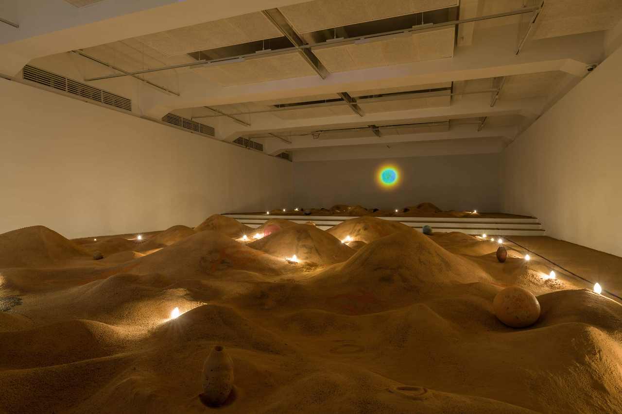 임민욱, 《하이퍼 옐로우》전시 전경. ⓒ스튜디오 오실로스코프[사진 제공=일민미술관](이하 상동). 스타니스와프 렘의 소설 『솔라리스』에 등장하는 솔라리스 행성의 바다는 인간의 사고로는 이해 불가능한 의식의 세계를 갖고 있고, 바로 그 지점에서, 인간 심연의 중핵을 차지하는 실재라 할 수 있다. 《하이퍼 옐로우》의 입구에 있는 임민욱의 〈솔라리스〉(2025. 코르크, LED 조명, 혼합 재료, 가변 크기.)는 이 행성의 지표면을 재현하는데, 그것은 주로 코르크라는 재료로 만든 황톳빛 봉분들의 형상을 하고 있으며, 공포 대신에 미지의 영역으로서 여러 자국, 문양, 사물 들을 관찰하고 탐사할 것을 요청하고 있다. 신발을 벗거나 덧신을 신고 들어간 관객이 맞는 건, 신체 전체를 감싸는 건 하나의 조망할 수 없는 공간이며, 이 전체는 하나의 장소이다.