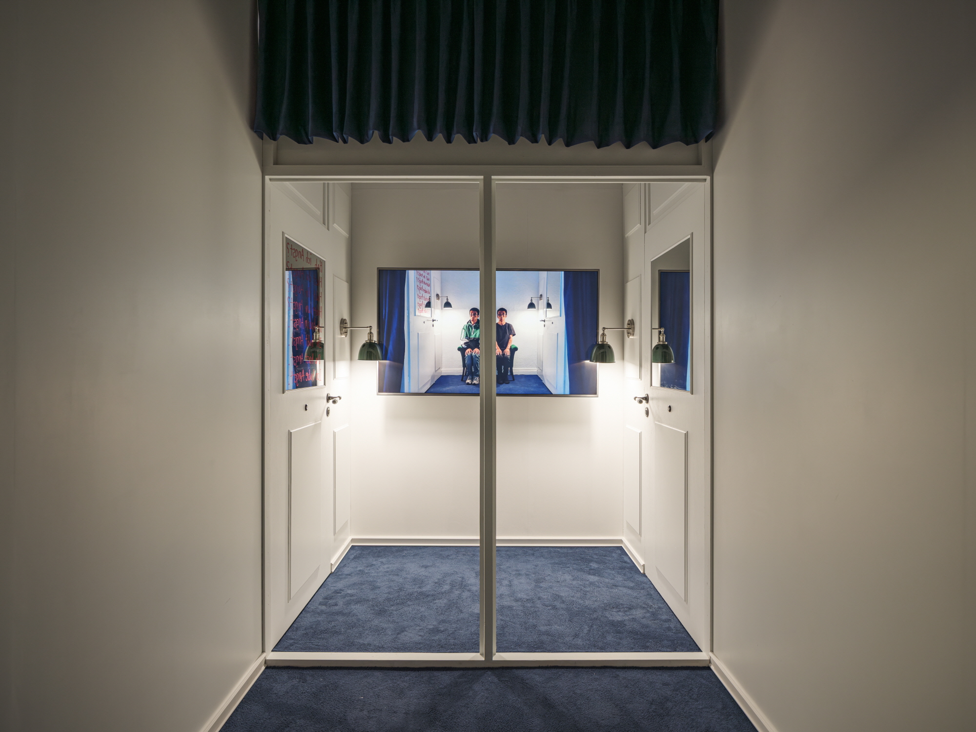 또한, 이는 공간 자체가 전제하는 효과이기도 한데, 무엇보다 《Doppel-Lumpen》은 d/p를 공간 안의 공간, 일종의 미로와도 같은 공간으로 재구조화하는 것으로 출발한다. 이는 입구를 통과하면 정방형 크기의 이중 유리문으로 된 일종의 작은 로비 공간으로서 그 같은 하나의 공간이 지닌 구조적 양상(을 자기 지시적으로 체현하는 영상)은 또 다른 공간들로 분기되는 지점을 통과하게 만든다. 그리고 동시에 어떤 공간의 안에, 방에 있다는 감각을 준다. 모든 것은 두려움/불안과 안전함의 뒤집힌 기호들의 내통이며 이행이다.