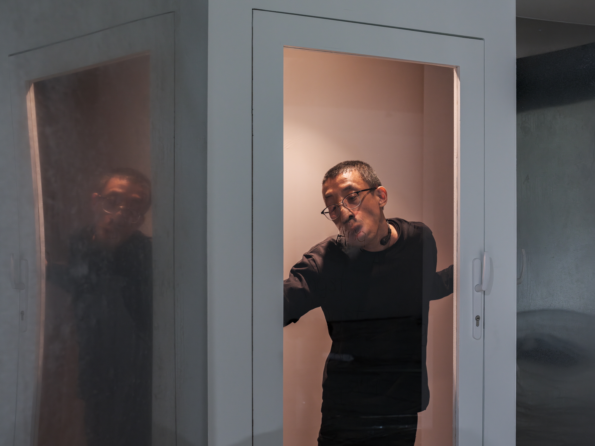 그리고 이는 작가에게 닿는 사회적 시선을 내재적인 차원으로 굴절시키며 이전하여 증폭시켜 가시화하는 것으로 연장된다. 그것은 절대적으로 숨으로 가시화되는데, 이 숨은 무엇보다 촉각적이다. 곧 얇은 막과 ‘나’의 사이에 작은 틈이 벌어졌다 닫히는 물리적 확장과 되돌아감의 끝없는 변주이다. 이것을 더 명확하게 시각화하는 것이 (이 퍼포먼스를 처음으로 두었을 때) 세 번째 퍼포먼스, 〈두려움 이후는 두려움 이전과 같다〉의 퍼포먼스로, 그는 이번에 비닐 막이 아닌, 투명 유리문 안 공간에 위치하며, 그 유리에 숨을 불어넣는다.