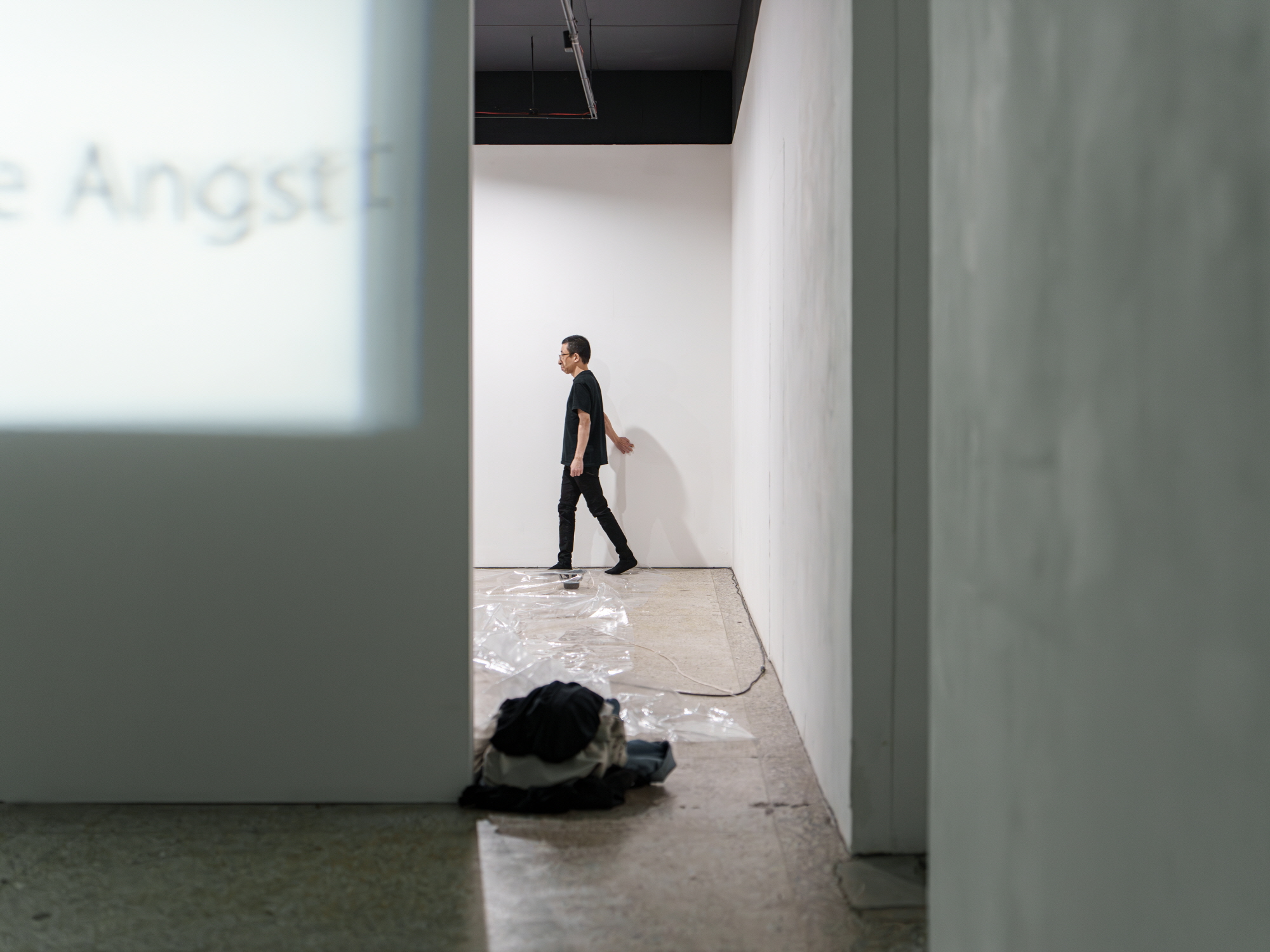 오른쪽 방문을 열고 들어갔을 때 자리한 〈Angst ohne Angst〉는 10대의 프로젝터가 제목의 문구를 하나의 위치를 향해 투사하면서 글자들의 분포는 흐릿하고 불투명하게 확장되는데, 프로젝터의 위치상 시야각이 발생할 수밖에 없다면, 10대의 ‘연합’은 이 중앙 관객의 몸을 투과하는 범위를 상쇄하는 데 충분하다. 그리고 그 일부가 관객의 등에 새겨진다는 걸 그 관객은 알더라도 볼 수는 없다. ‘불안(들)’이 없더라도 ‘불안’(들)은 남는다.