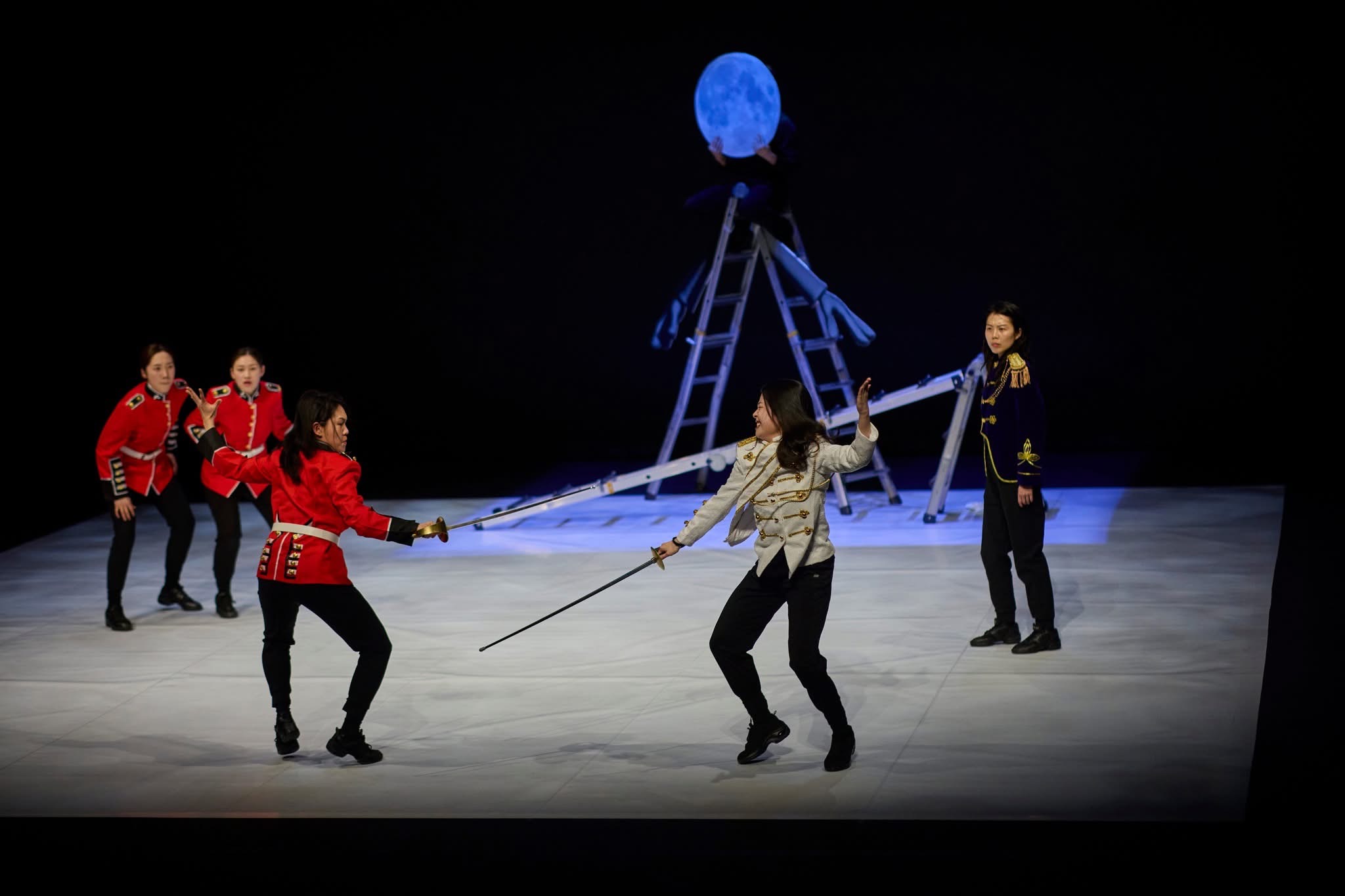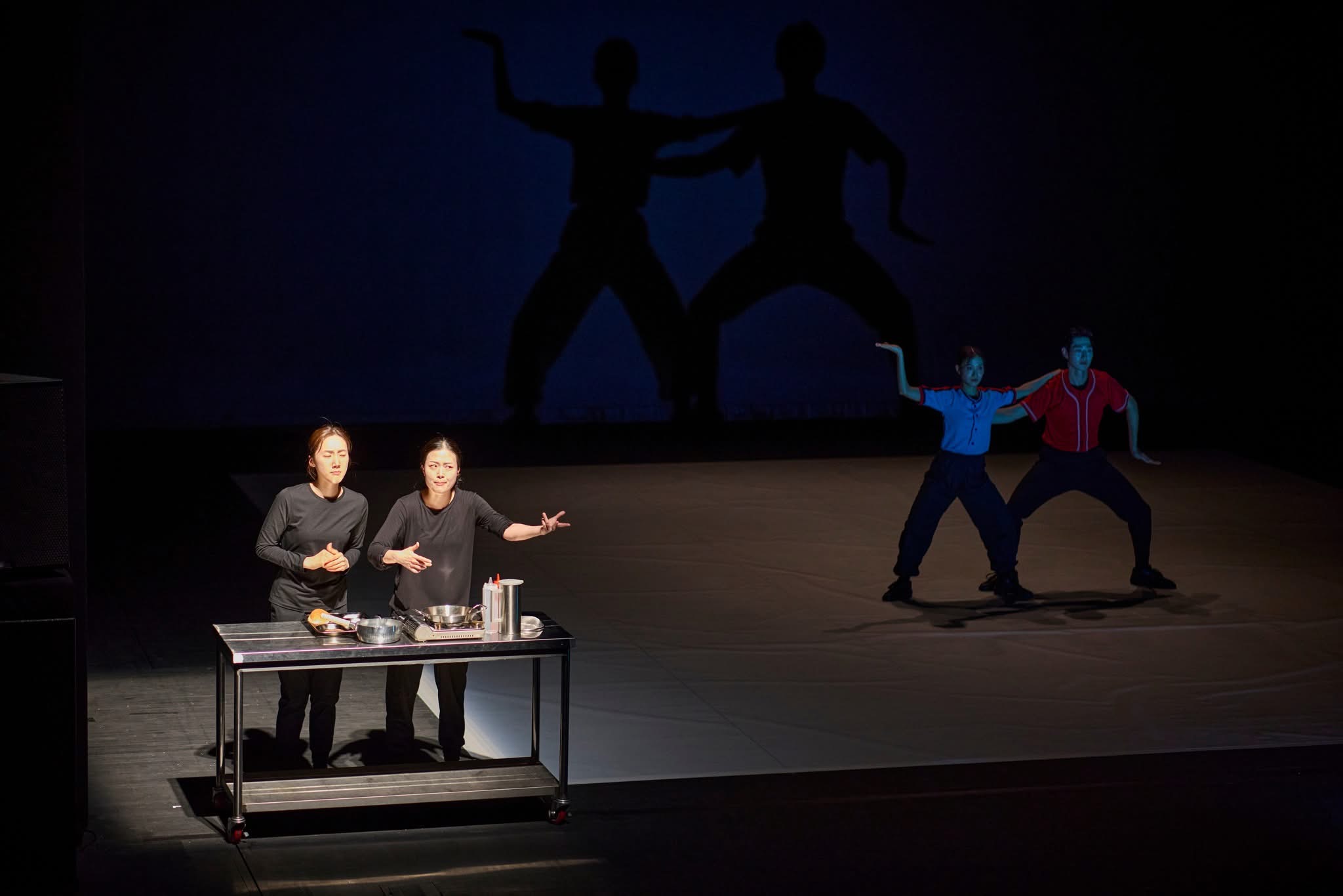 이미지의 기호 연쇄 작용 아래 배우들은 체스의 말들이 된다. 그리고 이는 맨 앞의 구술 인터뷰를 경유하는 불특정 다수의 대중이라는 형식을 충족한다. 그리고 마지막 〈돌아와요 부산항에〉를 배경음악으로 삼아 반복된 응원 춤의 텅 빈 형식이 보여주는 몸의 투명한 질서, 곧 부재하는 역할 속에 노동하는 몸의 충만함만이 공허하게 무대를 장식하는 것으로 수렴한다. 배우의 단단함은 그 반복을 정확한 틀의 산출로 유지하기 위한 순전한 고투로, 거기에는 어떤 정념도 투영되지 않는다.