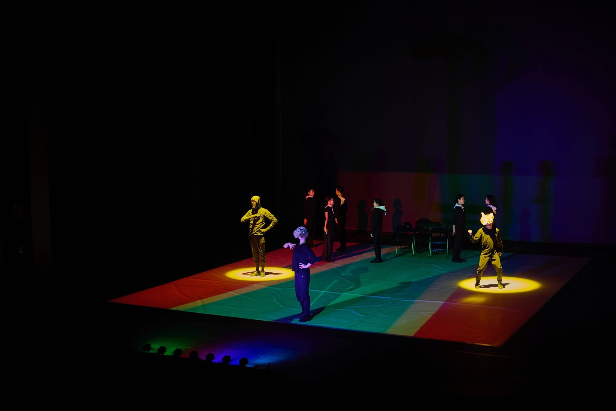 이미지의 기호 연쇄 작용 아래 배우들은 체스의 말들이 된다. 그리고 이는 맨 앞의 구술 인터뷰를 경유하는 불특정 다수의 대중이라는 형식을 충족한다. 그리고 마지막 〈돌아와요 부산항에〉를 배경음악으로 삼아 반복된 응원 춤의 텅 빈 형식이 보여주는 몸의 투명한 질서, 곧 부재하는 역할 속에 노동하는 몸의 충만함만이 공허하게 무대를 장식하는 것으로 수렴한다. 배우의 단단함은 그 반복을 정확한 틀의 산출로 유지하기 위한 순전한 고투로, 거기에는 어떤 정념도 투영되지 않는다.
