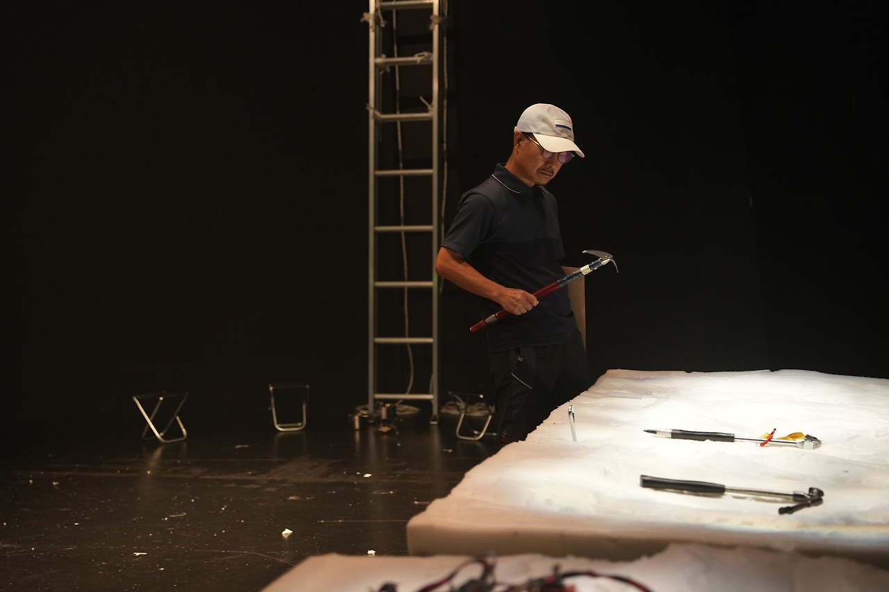 〈흙사람〉은 객석을 가로지르는 중앙의 계단 통로를 활용한 낙차적 설계, 산악의 표층을 재현하는 바퀴 달린 구조물들의 끊임없는 이동을 통한 재구조화로써 객석을 초과하고 무대를 뒤덮는 빙산의 태봉등을 등정하는 등장인물들의 자취를 형상화한다. 이로써 관객은 스펙터클한 상황에 접면하게 된다. 일종의 SF 차원의 가정은 상상적이기보다 수행적이고, 실재적이다. 이는 시간에 대한 감각의 차원에서도 그러한데, 장소의 끊임없는 이동은 인물들을 그 장소/위치에 고립시키고 한정시킨다.