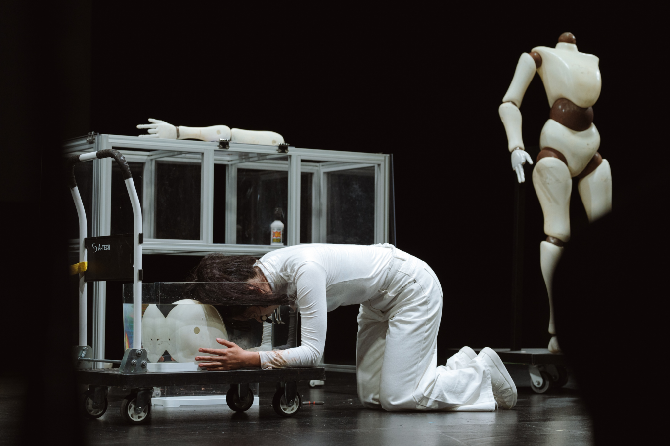 박수영, 〈Performance Test〉ⓒ남택근[사진 제공=국립현대무용단]. 박수영의 〈Performance Test〉는 엑스봇(Xbot)을 소개하고 그것과 동반된 일련의 여정을 재현한다. 엑스봇은 디지털상에서 뼈대를 심는 리깅 과정을 경유하며 생성된 자신의 3D 캐릭터 모델로, 이를 다시 오프라인으로 가져옴으로써 생기는 물리적 차원의 ‘부하‘, 곤궁을 연출하는데, 이것들은 그야말로 실재로 그를 엄습하는 감각의 차원을 수여한다. 현실에서 그에 대응하는 물리적 신체는 유사한 형태를 일차적으로 조직하는 것에 그친다는 점에서 지극히 환원적인데, 그것은 살이 아니라 딱딱한 피부, 3D 프린터로 용출한 플라스틱 소재의 갑옷 같은 싸개 조각들을 쇠구슬로 이어붙인 조립된 일종의 박수영의 휴먼 스케일에 대응하는 프라모델 모델에 가깝다.