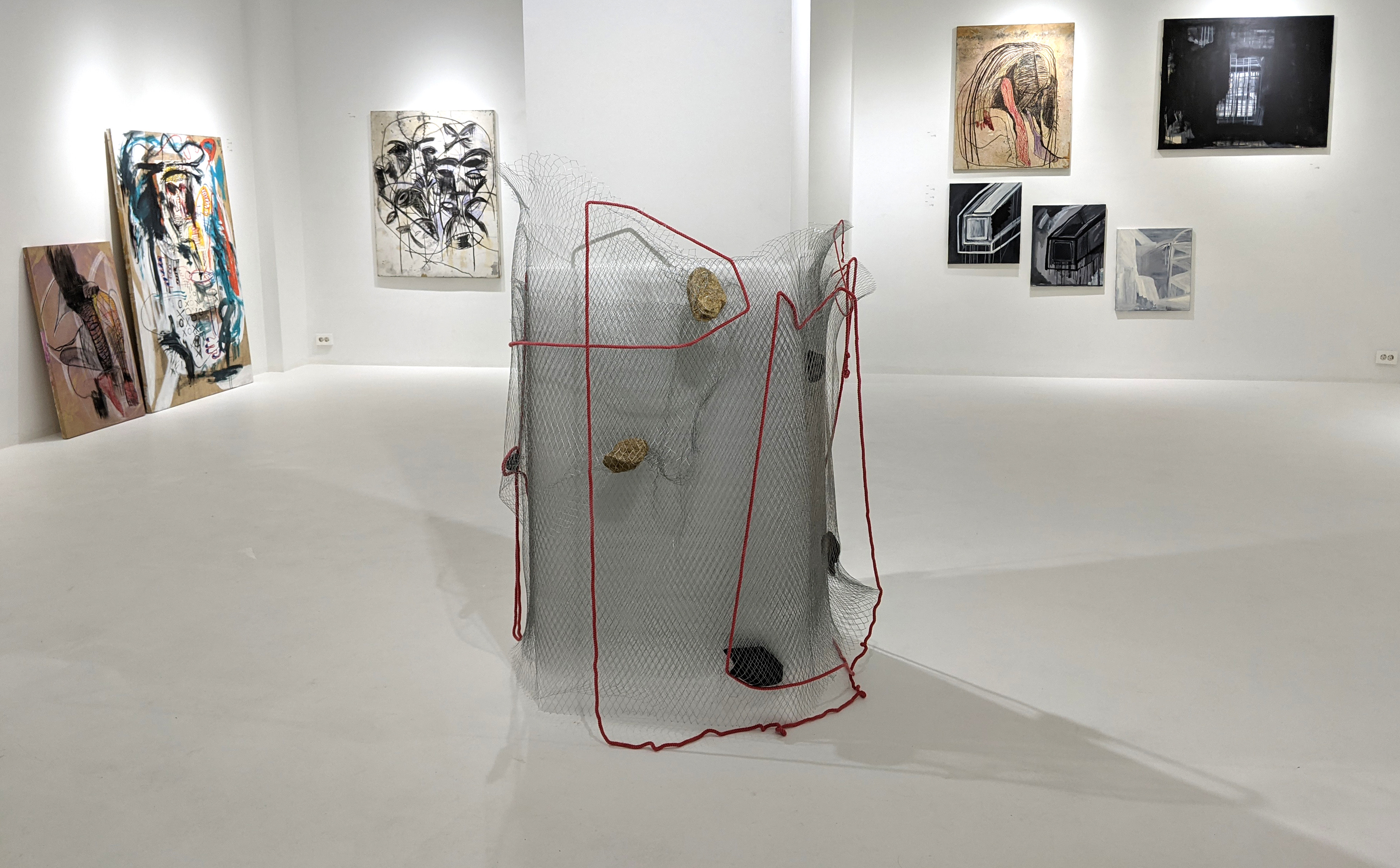 그러한 원리로서 역으로 전이되는 이 작업은 캔버스라는 네모난 틀을 공간적으로 확장시킨 철망과 그것에 접속하며 분기되는 선분들로서 재정립되는데, 평면의 한계 내에서 그 확장을 꾀하며 캔버스라는 토대를 시험하는 캔버스 위의 캔버스, 곧 캔버스 위의 작은 평면들의 이행, 그리고 몇 점의 회화들에 주요한, 의미 없이 형상 위를 휘젓는 자유로운 선분들 또는 형상들을 잇는 최종의 조작으로서 그 형상을 지탱하는 형태적으로 비교적 자유로운 선분들은, 이 조각-설치-이미지의 토대를 회화(의 실험으)로써 나타내고 있는 것이다.이러한 실험은 얼굴-신체의 형상적 추출, 드로잉에서 연장된 회화적인 회화, 형상의 추상성, 입체에 대한 회화적 대응, 형식으로서 형상 등과 같이 몇 개의 군으로 구분 지어 나타나는데, 이는 제목이 서사의 내용이라기보다 서사 자체를 지시하는 바와 같이, 특정한, 일정한 내용으로 수렴하기보다 오히려 그 결과를 묘사하는 차원에서 후술로서 더해지는 것으로 보인다. 그럼에도 그중 직접적으로 또 어렴풋하게 가장 많이 출현하는 ‘얼굴’은 추상성을 획득하며 사실성에 전혀 입각하지 않은 것이기도 하지만, 더 정확히는 무엇보다 내용을 지닌 형상으로는 근본적인 최소한의 단위로서 자리함으로써 회화의 토대를 구성해 내는 데 가깝다.