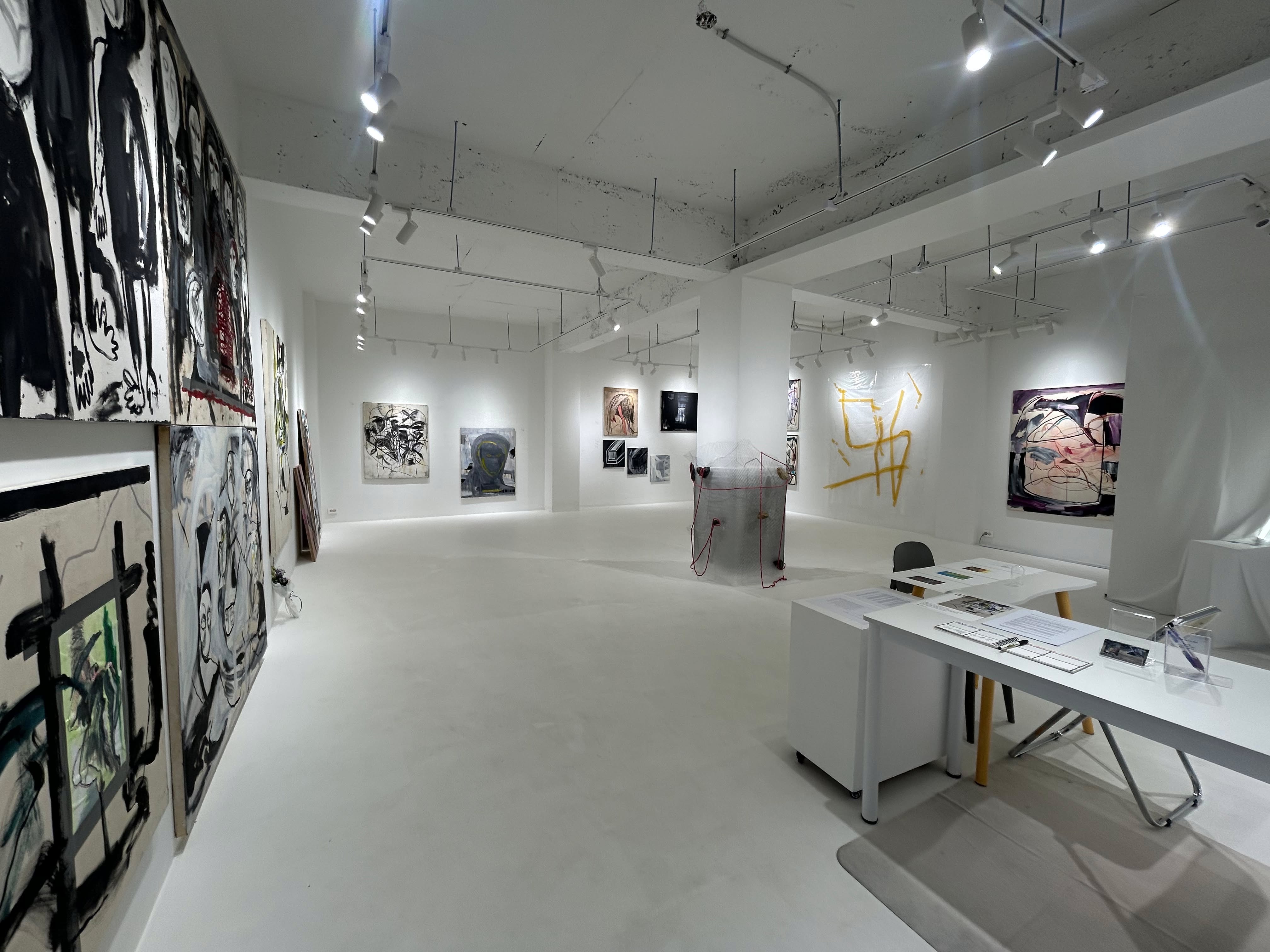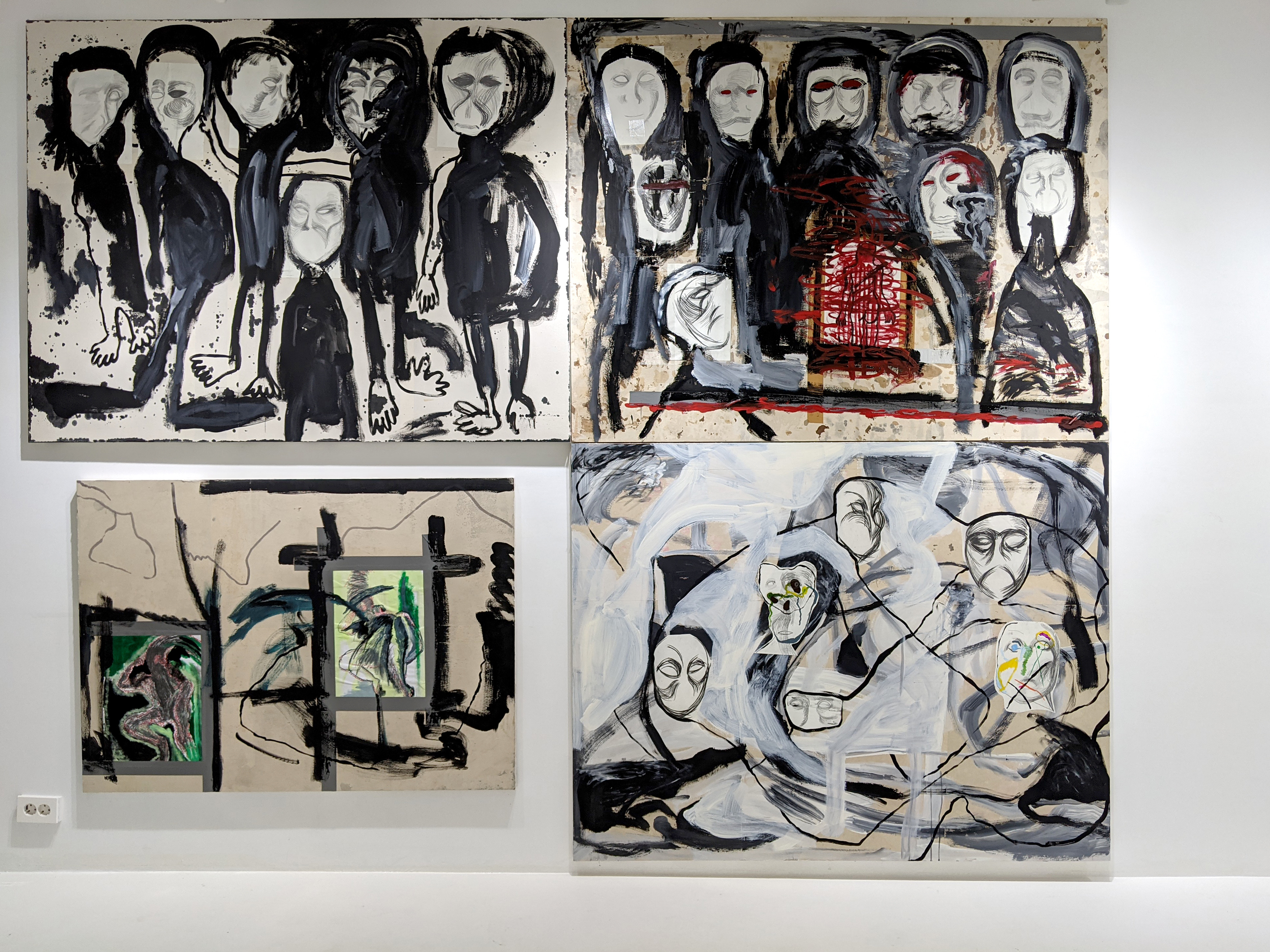 몇 개의 얼굴 시리즈, 〈구겨진 얼굴1〉(2025. Mixed media on panel, 130.3×162.2cm.), 〈구겨진 얼굴2〉(2025. Mixed media on panel, 130.3×162.2cm.), 〈흩날리는 얼굴〉(2025. Mixed media on panel, 130.3×162.2cm.)의 경우, 검은 굵은 신체의 윤곽 아래, 가늘게 쌓아 올린 눈코입의 윤곽은 신체와 얼굴의 대비 아래 마스크로서 얼굴의 특성을 강조한다. 〈어긋난 얼굴들〉(2025. Charcole and Contre on panel, 117.5×95cm.)의 경우, 얼굴은 하나의 형식으로 특정되는데, 눈코입의 윤곽과 얼굴의 윤곽만 남긴 간략화된 마스크들만의 중첩된, 곧 윤곽이 또 다른 윤곽으로 연장되며 그 둥근 선분들의 집산체로서 또는 도형 놀이의 결과로서 마스크들이 추출되고 있는 형상이다.특히 ‘구겨진 얼굴’ 두 작업은 얼굴-신체의 과잉적 집산으로 배경을 거의 대담한 검은 토대의 무뚝뚝한 신체가 반복적으로 더해지며 차지하는 가운데, 형상으로 기능하는 얼굴의 차이들은 그 안에서 희미하게 인지되는 정도에 그치게 되는데, 이는 정확히 그 관계들을 형식적으로만 탐색하며, 얼굴-신체의 선형성, 곧 위와 아래의 구분, 그리고 얼굴이고 또 신체인 최소한의 인지 정도만을 포함함으로써 캔버스를 대하는 기본적인 시각 체제만을 반복하게 된다는 점에서, 이 회화의 목적은 형상으로써만 곧 형상 안의 형상을 나타냄으로써 그 배경을 대체하기 위함으로 보이는 것이다.