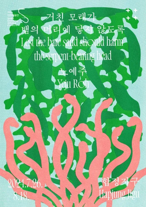 노예주, 《거친 모래가 뱀의 머리에 닿지 않도록》 포스터. 노예주 작가의 회화들, 그리고 일련의 글이 덧붙여진 전시 《거친 모래가 뱀의 머리에 닿지 않도록》은 크게 전시 공간인 합정지구의 1층과 지하의 구분을 따라, 각각 인물과 사물 혹은 인물과 배경으로 나뉜다. 이러한 대상을 기준으로 한 구별은 피상적이고도 자의적인 기준 이외의 것을 제시할 수 없을 것이다.