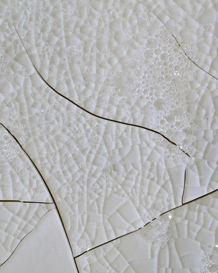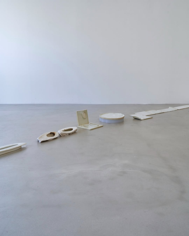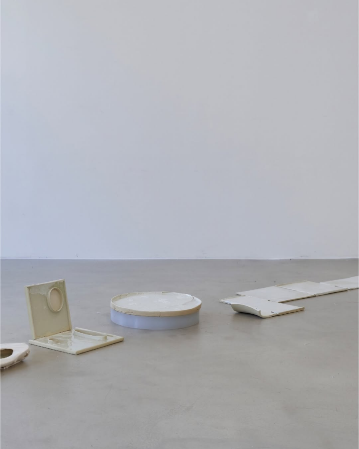 기포를 머금은 채 결정된 동그란 접시 모양의 오브제가 성형 중에 깨어지며 남긴 내재적 틈들 역시 그러하다―〈#8〉(2026. Modeling clay, glass, fired at 1220°C, 34.5×2cm.)―. 반쯤 쪼깨지며 반쯤 결합된 이 오브제는 필연적인 우연성의 틈을 가장 명확하고 역동적으로 보여준다. 한편 경로를 이탈하며, 오른쪽 끄트머리 아래에 금 간 공간 바닥의 틈에는 깨어진 콘크리트 조각들과 함께 대등한 크기의 하얀 돌 파편으로서 오브제들을 비슷한 숫자로 뒤섞어 놓았는데, 결국 틈을 메우는 것들이 그것들 사이에서 또 다른 틈을 만든다. 그러니까 사물들은 결국 틈으로서 놓일 수밖에 없다. 조화와 조합의 합목적성의 논리를 가장한 임시적, 얕은, 불완전한 퇴적층으로서 사물들이 우연하게 필연적으로 놓인다.