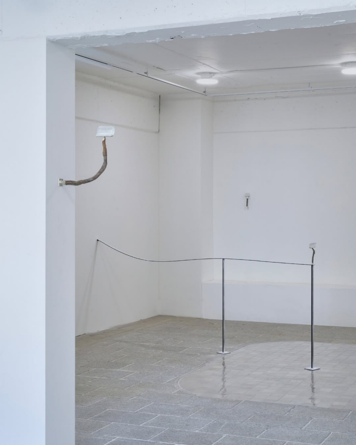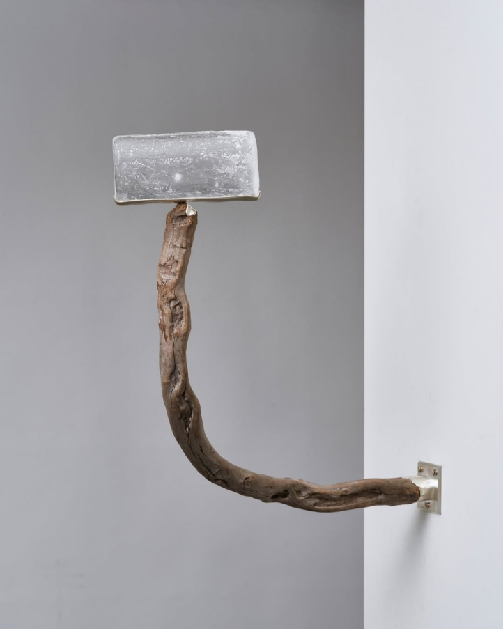 벽을 기점으로 구조물의 끄트머리, 기둥 위로 가로로 누인 직사각형 ‘얼음’을 구부러진 나무―〈#12›, 2026. Glass, gatherd branches, silver, 8×19×5cm.)1―가 박혀 있는데, 예컨대 활주로의 끝을 가리키는 표지물이라 하겠다. 이 수직으로 솟은 지지대 위에 올라간 얼음 모양의 투명한 조각이라는 형상은 두 번 더 반복되며 독립된 기호로 자리한다. 곧 90도로 꺾어지는 벽에 하나―‹#13›(2026. Glass, gatherd branches, silver-plated brass, 6×18×5.5cm.)―, 그 맞은편 칸막이벽의 상단에 하나―〈#11›(2026. Glass, gatherd branches, silver, 3×3.5×8cm.)―가 더 있다. 전자가 페인트 붓이라면, 후자는 유연한 벽 조명처럼 보이는데, 이는 마찬가지로 재현적 형상으로 환원되는 것이 아니라 임시적 조합의 기법으로서 아상블라주적 전략의 상상력으로 소급되어 간다. 작가는 재현적인 형상의 일부를 전용함으로써 또는 분리된 조각을 재현적인 것 속에 끼워 넣음으로써 사물을 기능으로부터 해방시키면서 해석을 유예하는 잠재적 기호로 구성한다.