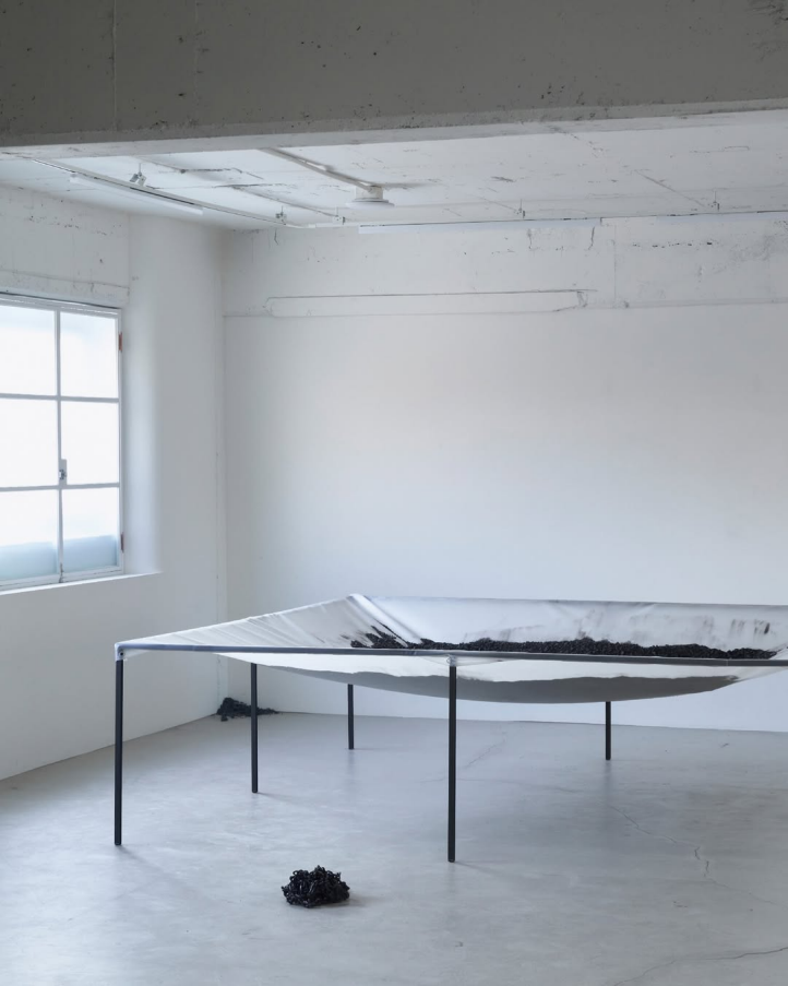 이를 기점으로, 공간 안쪽에는 네 개의 폴대 위로 정사각형 텐트를 두르고 거기에 검은 돌 모양 결정들을 깔고 군데군데 구릿빛 상자, 투명 얼음, 깨진 조각, 쇠사슬(이것은 일종의 제유로서, 바닥 모서리에는 그것의 전체, 곧 뭉쳐진 쇠사슬 고리가 있다. 이는 한 가닥이 엉키고 풀리고 하며 길게 나와 있다.) 등의 조형 오브제들을 위치시켰다―〈#15〉(2026. Glazed and unglazed black clay, glazed modeling clay, glass, burned paper.)―. 결국 흙 속의 예외적 오브제들은 틈을 내고 틈으로서 자리한다. 다시 반복하면, 그것들은 ‘불완전한 퇴적층으로서 사물들이 우연하게 필연적으로 놓인다.’