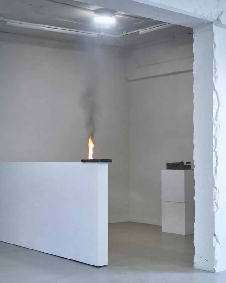 전시는 두 개 층으로 구성되는데, 경첩과 얼음의 오브제들이 유백색 흙으로부터 기원했다면, 위층에는 검은 흙이 주재료를 이룬다. 곧 전시는 하얀색과 검은색 두 지층의 대비로 갈음되는데, 후자에서 기점이 되는 오브제는 입구 맞은편 낮은 칸막이벽 위에 올려진, 검게 그을린, 부르세라 나무 수지를 얹은 구릿빛 직사각형 쟁반인데, 이는 하루 중 네 번에 걸쳐 불타오른다. 해당 벽 안쪽에 기입한 네 개의 시간과 그 위로 올라가며 이룬 하나의 화살표가 “burning time”을 가리키고 있는데, 이 포물선의 형상은 물론 불길에 조응한다.