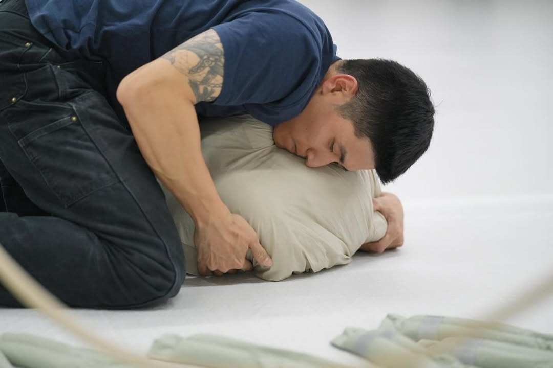 곽소진, 〈파라〉[사진 제공=서울시립 서서울미술관](이하 상동). 곽소진 작가의 〈파라〉는 낙하부대(Paratrooper)의 존재들과 낙하산(Parachute)이라는 물질 사이에서 합성되는 여러 관계의 양상을 하나의 안무적인 이행의 과정으로 기입하는 퍼포먼스이다. 제목의 “Para”는 앞의 두 단어를 묶는 접두사로서, 하나의 단어로서 전용된 것이다. 낙하부대에는 일종의 낙하산 포장병(박태준)과 낙하병(김산), 통신병(조승호)이 있는데, 각각 낙하산을 포장하고, 낙하 모의 훈련을 실시하며, 무선 통신(의 잡음)을 송신한다. 이때 낙하산 포장병과 낙하병은 지하와 지상으로 나뉘어 배치되는데, 이를 교통할 수 있게 하는 계단에는 통신병이 자리하며, 그가 내는 소리가 지하와 지상의 스피커로 전파된다.