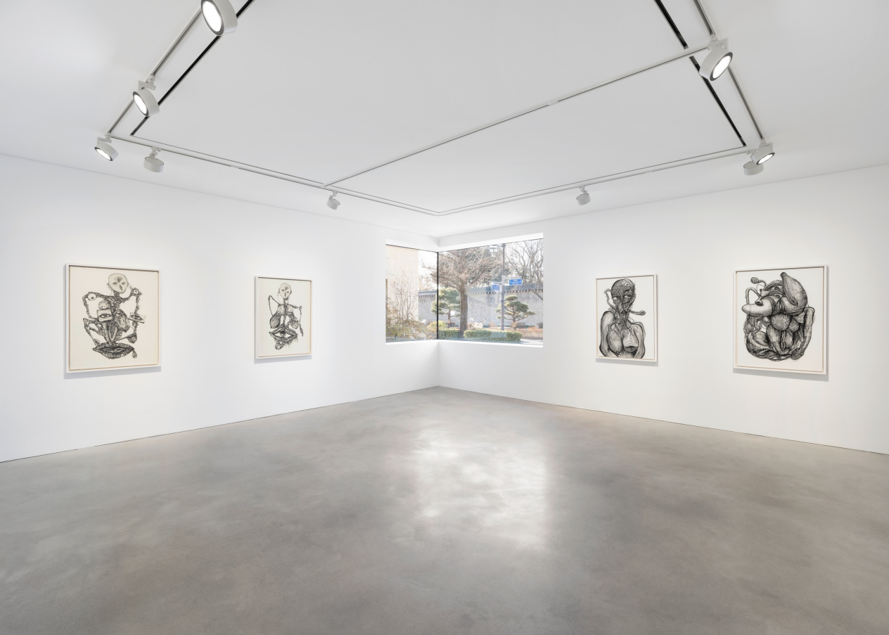 마지막으로 전시장에서 가장 먼저 볼 수 있는 종이 위의 목탄 드로잉은 조금 더 뚜렷하게, 그리고 명확하게 신체 자체의 이형적 질서를 조망할 수 있게 한다는 지점에서, 살펴볼 필요가 있는데―1층 첫 번째 방의 작업들은 그 외에도 에칭, 드라이포인트 등의 요판 인쇄 기법이 사용되었지만, 역시 배경의 종이가 드러난 신체 형상이며 대체로 검은색이다.―, 이는 배경을 남겨둔, 그것은 기형적이지만 식별 가능한 인간의 신체 형상으로, 대체로 눈이 여러 개며 위아래로 배치되어 있다. 이때 신체의 위계-수직적 배분은 분화와 증식의 차원에서 다소 둔화된다. 그것이 눈의 원래 위치를 부정하거나 소거하지 않는 가운데 그러하다는 점에서 말이다.
