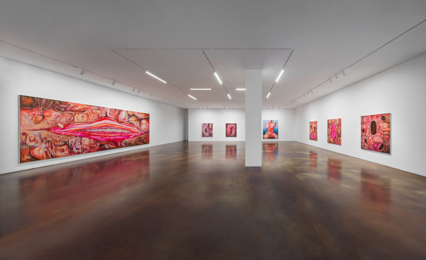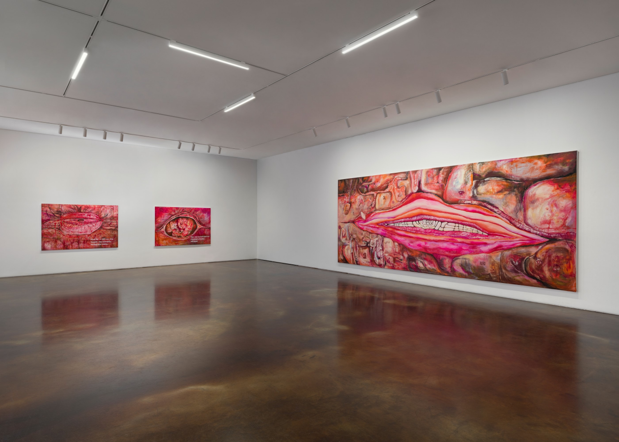장파, 《GORE DECO》 전시 전경[사진 제공=국제갤러리](이하 상동). 《GORE DECO》를 통해 새롭게 도입된 가장 눈에 띄는 요소는 타투이다. 실크스크린으로 처리된 이 부분은 그야말로 신체에 새겨진 것이 아니라, 찍힌 것인데, 이는 역설적으로 핏빛 내장으로서 피부에 또다시 파고들어 녹아든 지표적 흔적으로서가 아니라 그림과 분리되는 순수한 기표들의 놀이로서 회화 ‘위’에 쌓이며 그것을 회화로 (자신을 타투라는 이미지―이는 일종의 접착된 스티커다.―로) 지시한다.