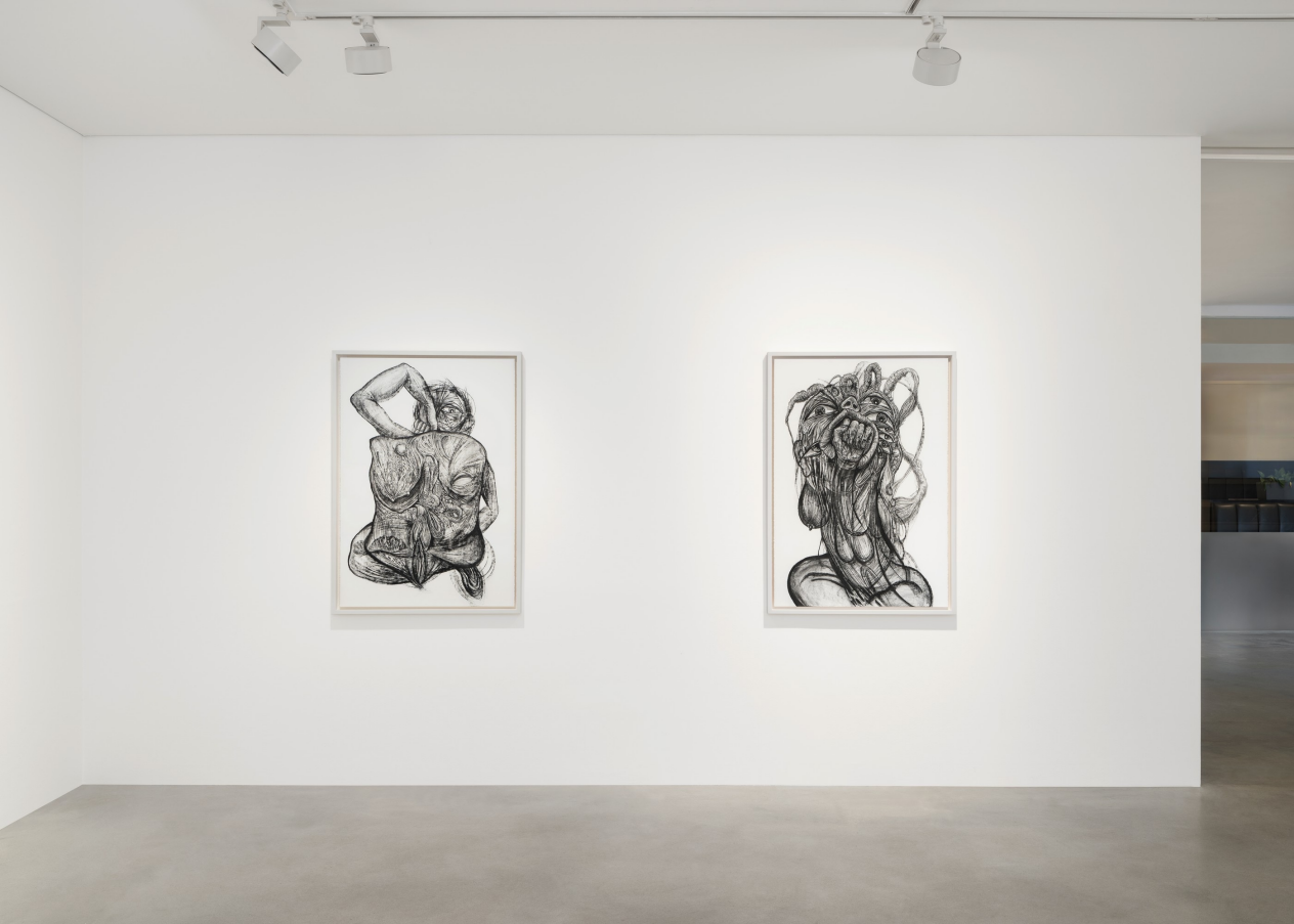 [사진 우측=]〈Drawing for Gore Deco #1〉. 전적인 맞교환은 불가능할까. 〈Drawing for Gore Deco #1〉(2025. Charcoal on paper, 110×76cm.)은 여러 개의 눈이 쌓여 나가거나 여러 개의 유방으로의 증식 과정의 흔적이 남는데―하나만 유두가 뚜렷하다.―, 가령 눈의 위치에 유방이, 유방의 위치에 눈이 있는 것이다. 그러니까 눈-유방의 수직 구도 이전에, 얼굴-몸의 수직 구도가 있는데, 작가는 이것을 해체하지 않는다. 그리하여 유방은 풍만한 것으로 더 큰 형상 안에 위치해야 하는 것이다―눈의 크기 또한 이 얼굴의 재현에 입각하며, 〈Drawing for Gore Deco #2〉(2025. Charcoal on paper, 110×76cm.)에서 가장 아래 유방 끄트머리에 ‘적합하게’ 채워진/끼워진 눈은 위쪽 눈의 크기와 거의 대등하다(그러니까 눈의 비율은 일반적인 신체 비율이라는 심미적 질서를 따르며, 그것은 또한 재현적 질서이다.).
