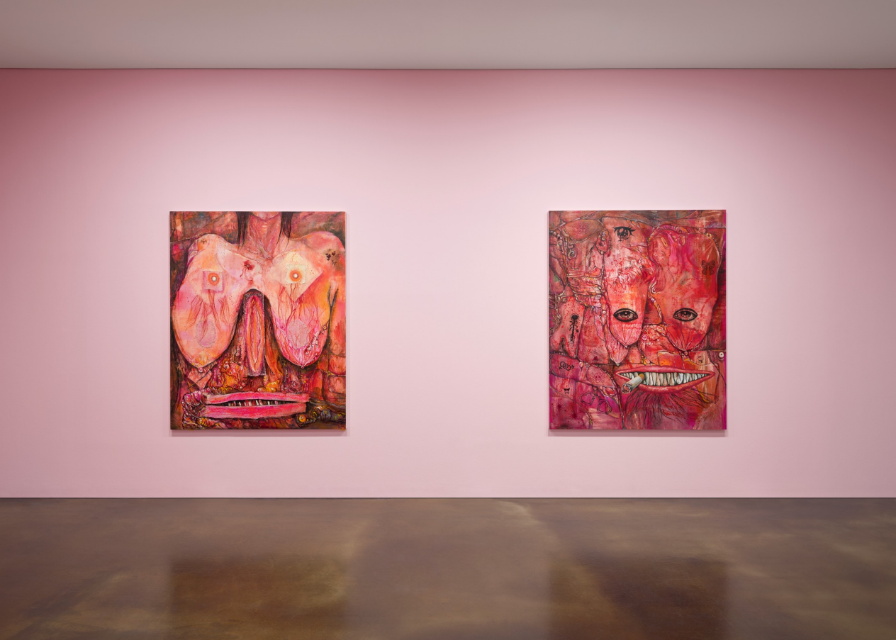 [사진 오른쪽=]〈Gore Deco - Tattoo, Cigarette, Piercing〉. 〈Gore Deco - Emily #1〉(2025. Oil, fishnet stocking, gauze, jute, silkscreen, human and synthetic hair on linen, 130.3× 193.9cm.)는 이 삼베와 거즈 자체의 물질성, 그것의 투과성 자체의 물리적 특질을 부각하는데, 그것은 거대한 캔버스를 채운 커다란 눈-입술―보지의 대리물―을 생리대라는 물질로 (올바로) 체현한다. 그리고 그 위에 붙인 머리카락은 눈썹―보지 털에 대응한다.―을 표현한다. 이 거대 눈 상반으로 삐죽 솟아 나온 머리카락은 이 홀눈의 구멍과 조응되며 생기론적 사물을 넘어, 꿈틀대는 욕망의 진원지, 그것이 실체로 나타난 것과 같다.
